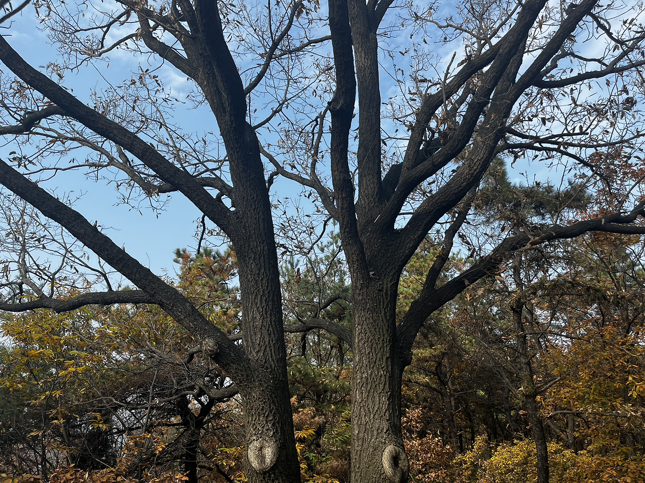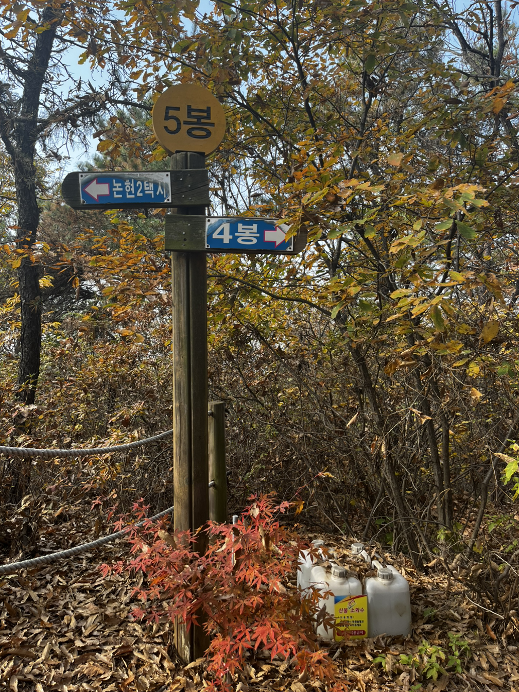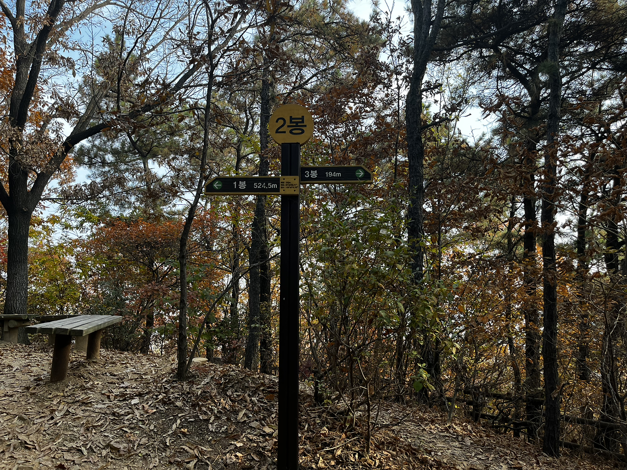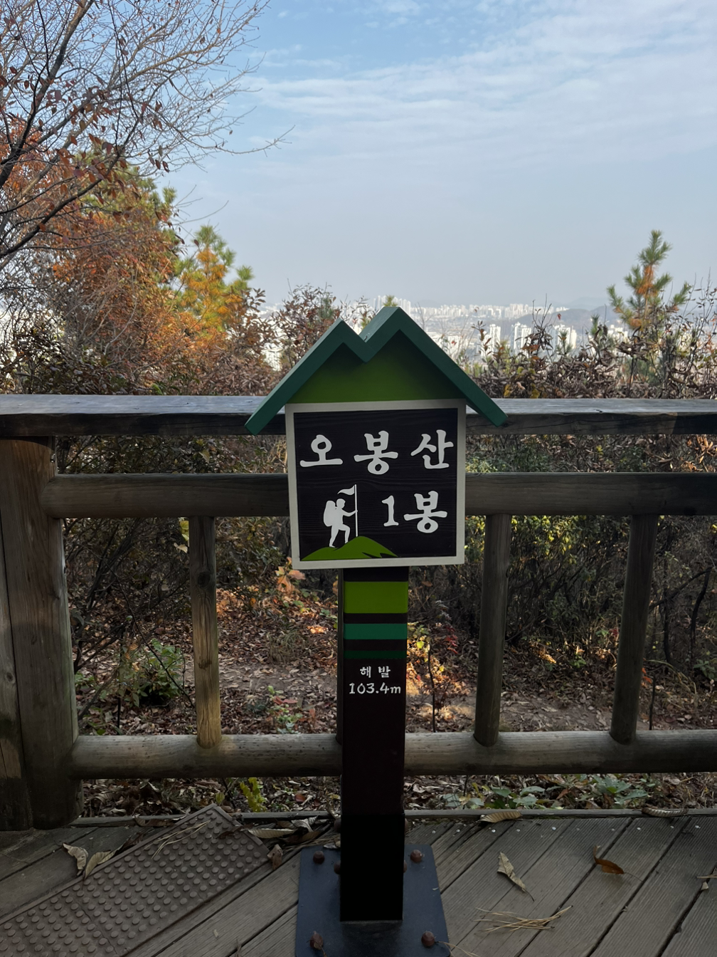 주택단지를 지나 산길로 이어지는 계단을 오르며 자연스레 산을 올랐다. 낙엽이 떨어진 산길은 구경거리도 많고 아름다웠지만, 미끄러워서 자칫 발을 헛디디면 미끄러져 심하게 다칠 수 있는 상황이었다. 조심조심 오르다 보니 듬베산 정상에 도착을 했다. 인증석은 따로 없었는데 누군가가 친절하게 <듬베산 정상>이라고 사인펜으로 써두었다. 누가 써두었을까? 기분 좋게 내려와서 듬베산에서 이어지는 오봉산으로 향했다.