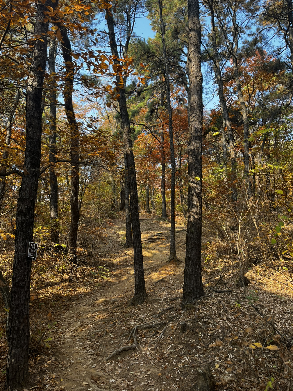 오봉산은 이름에서 예상할 수 있듯이 산 봉우리가 5개여서 오봉산이었다. 5개의 봉우리를 찾아 오르락내리락하는 재미가 있었다. 오봉산은 듬베산보다는 길이 조금 험하고 가파렀었다. 그래도 오를만했었다. 안내표식을 따라 가는데 남동 둘레길 안내표식은 다섯 번째 봉우리인 오봉의 정상을 안내하진 않았고 정상을 못미처서 내려가도록 안내되어 있다. 산을 한번 오르면 어떤 산이든 정상을 갔다 와야 하는 나로서는 오봉의 정상에 거의 다 와서 정상을 가지 않는다는 건 있을 수 없는 일이었다. 그래서 안내표식과 반대쪽으로 올라갔다 왔다. 정상에 가니 특별한 건 없었다. 나무에 가려져 잘 보이지 않았던 전망, 특히 오봉산에는 리기다소나무가 많았다. 그래도 정상에 다녀왔다는 뿌듯함이 마음 한 구석에 자리 잡았다.