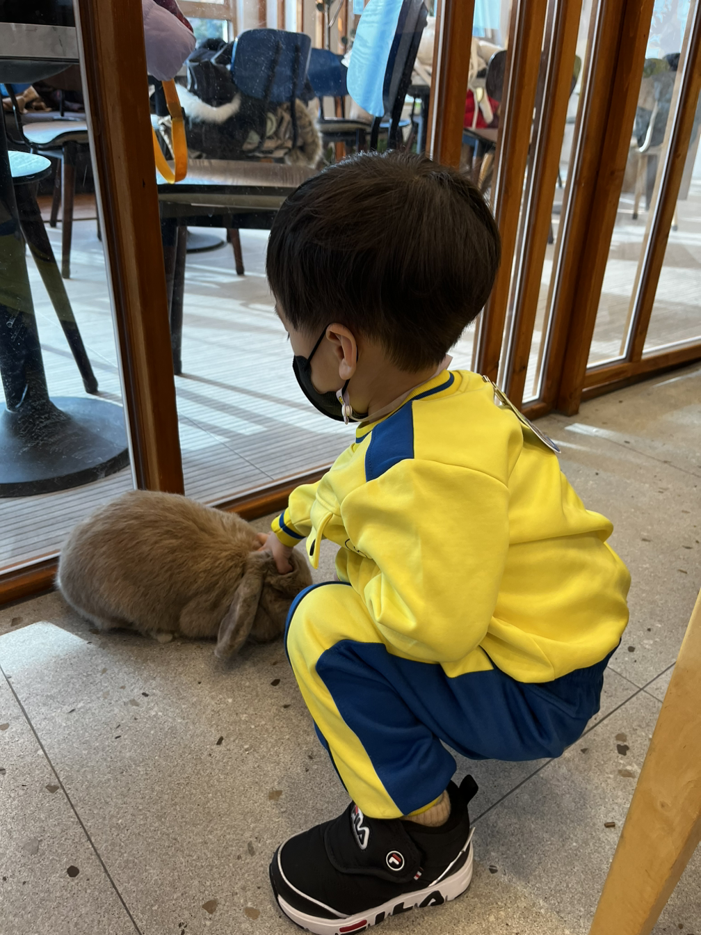 아들 녀석은 처음에 동물들에게 다가가길 주저했었다. 계속 동물들 앞에 데려다 놓으면 문가로만 가 있던 아이. 나도 앞서 말했듯 동물을 무서워하기에 카페에 풀어놓은 염소나 토끼, 고양이 이런 동물들이 다가오는 게 무서웠지만 아들 녀석이 동물과 교감했으면 했기에 엄마니까 용기를 냈었다. 그리고 신기하게도 엄마니까 용기가 났었다. 엄마이기에 더 즐겨야 했다. 내가 즐기는 모습을 보여야 아들 녀석은 더 즐길 것 같았으므로.