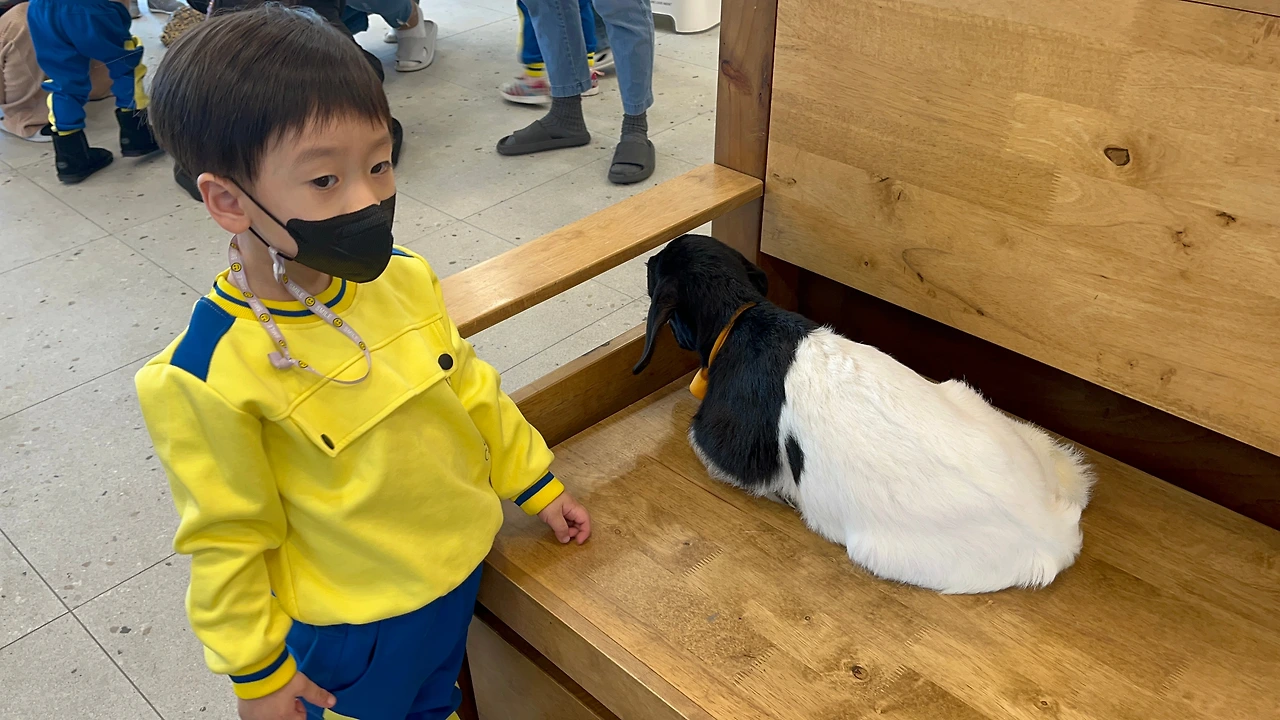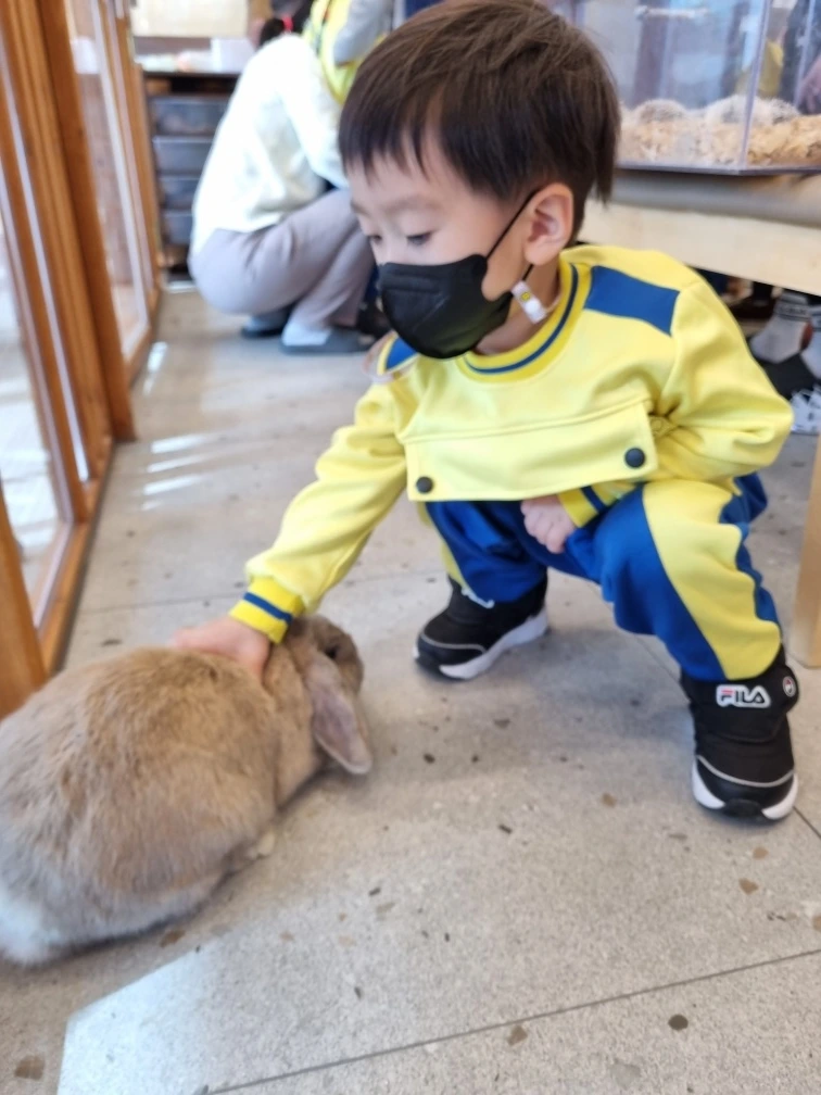 아들과 어린이집 친구들, 선생님들이 설명을 듣고 있었다. 계속 같이 있었고 등원까지 해줬던 아들이었는데도 불과 1-2시간 만에 다시 만나니 반갑고 애틋했었다. 동물 카페는 원래 12시부터였지만 영유아 어린이집 단체관람은 영업시간 전 오전에 일찍 해주시는 것 같았다. 그래서 더 아이들이 거리낌 없이 즐기면서 체험할 수 있을 것 같았다. 간단한 설명을 듣고 드디어 동물들에게로 입장! 을 했는데 우리 아들 녀석뿐만 아니라 아이들이 다 겁에 질려 가까이 다가가지 못하고 우는 아이들이 속출했었다.