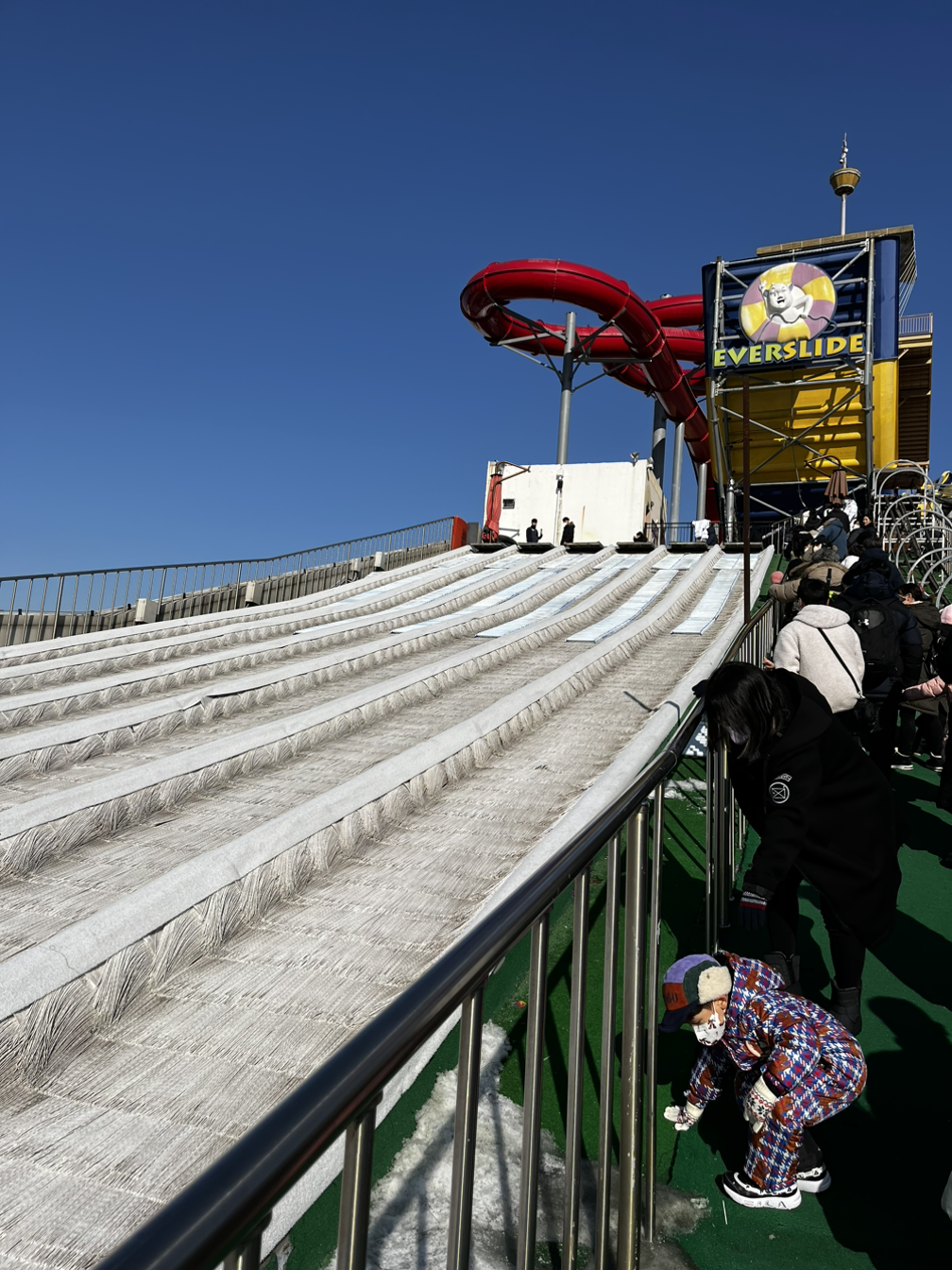 헬멧을 답답해하던 아이를 데리고 곧장 나와 엘리베이터를 타고 3층으로 올라갔다. 야외썰매는 헬멧을 안 써도 된다고 해서 아이가 더 잘 즐길 수 있을 것 같았다. 그리고 야외썰매 같은 경우 나와 같이 탈 수 있을 것 같아 더 안심이 됐었다. 그렇게 야외썰매장으로 갔는데 엄청난 인파에 그만 놀라고 말았다.