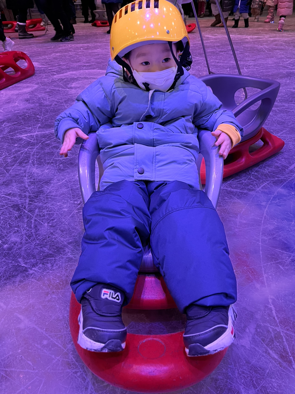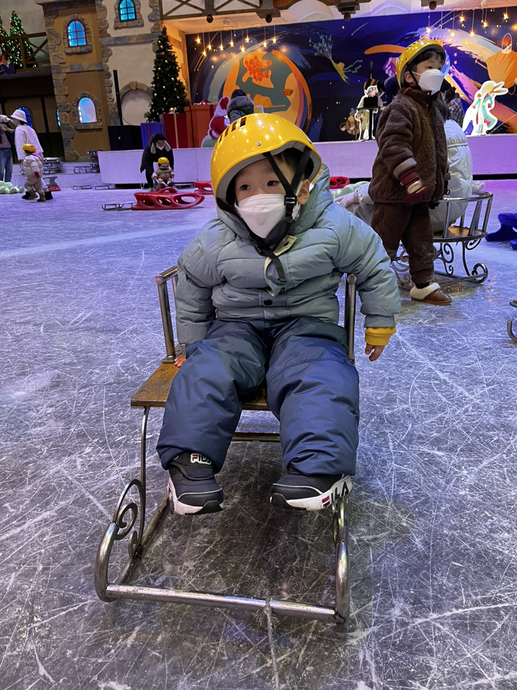 썰매장은 실내 실외로 구분되어 있었다. 우린 우선 실내부터 입장을 했다. 아이들의 방학시즌이라 그랬는지 사람이 어마어마했다. 실내에는 회전목마와 얼음썰매장, 그리고 키 120센티 미만의 어린이들만 탈 수 있는 미니썰매장이 있었다. 아직 경험이 부족하고 겁이 많아서 그런지 혼자서 놀이기구는 절대 안 타려고 하는 아들 녀석 때문에 회전목마와 미니썰매는 가볍게 지나쳤다. 언제쯤 혼자서 겁먹지 않고 탈 수 있으려나. 언제쯤 자연스럽게 경험할 수 있게 해 주면 좋을지 늘 고민이었다. 얼음썰매장에 입장하려 하는데 안전을 위해 아이들의 헬멧착용은 필수였다. 그러나 머리에 무언가 쓰는 걸 병적으로 싫어하는 아들 녀석. 헬멧을 씌우니 울고불고 난리가 났었다.