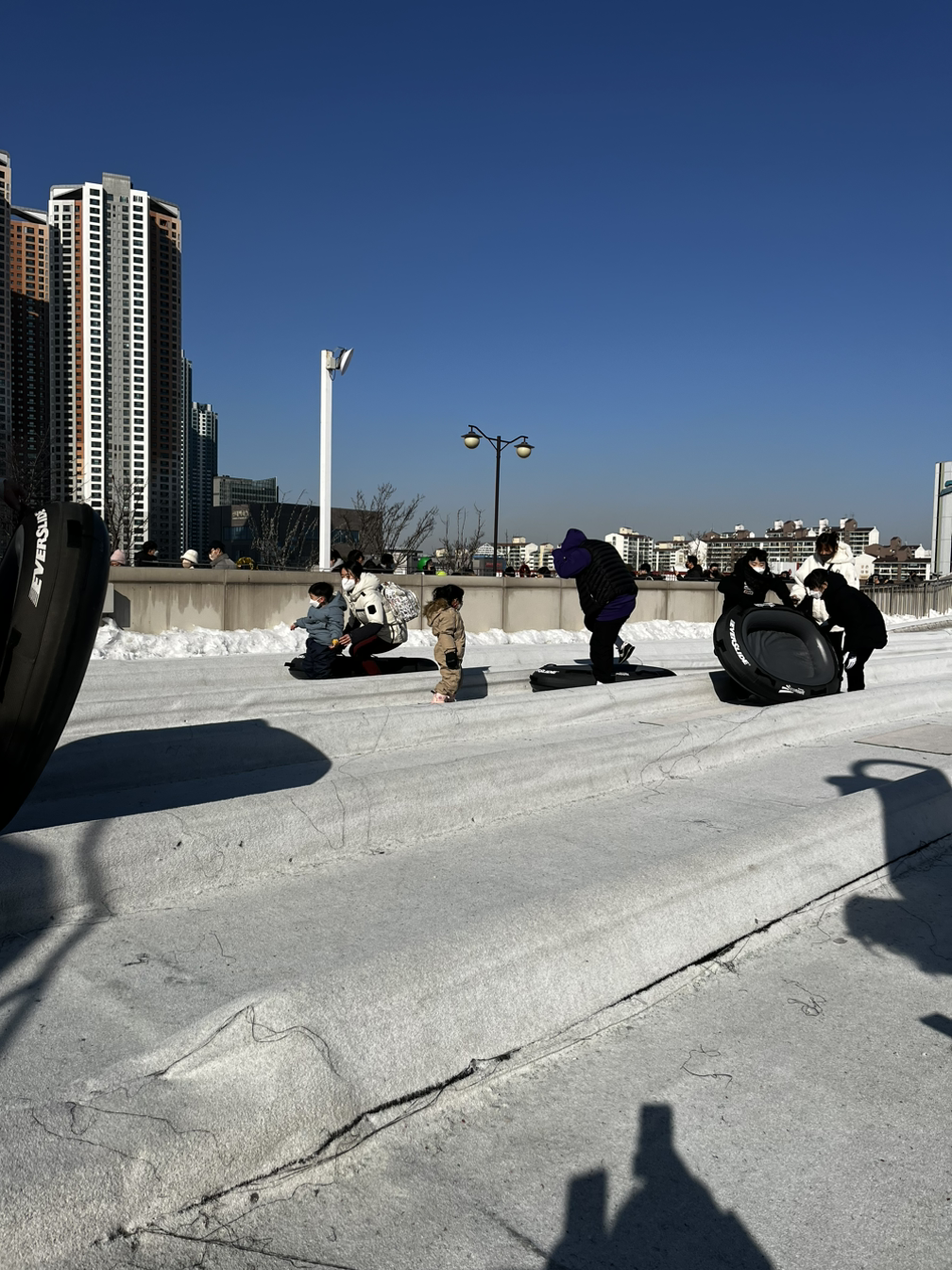 비록 몇십 분 차이였지만 야외 썰매장에 대한 정보가 부족해 늦게 왔던 게 아쉬웠다. 그래도 엄청난 인파에 비해 줄은 생각보다 빨리 줄어들었다. 기다리면서 다른 사람들이 타는 모습을 보여주었는데 재밌어 보였는지 빠르게 내려오는 모습을 보며 아들 녀석은 실실 웃었다. 아이가 좋아할 거 같아 다행이었다. 드디어 우리 차례가 되었다. 우리 앞에 있던 안 타시는 분에게 실례를 무릅쓰고 아이와 추억을 남기고자 동영상을 부탁했었다. 거절하면 어쩌나 약간 걱정이 됐었는데 난감해하시면서도 부탁을 들어주셨다.