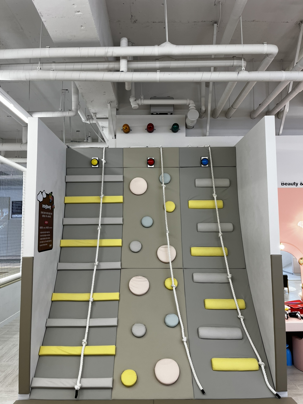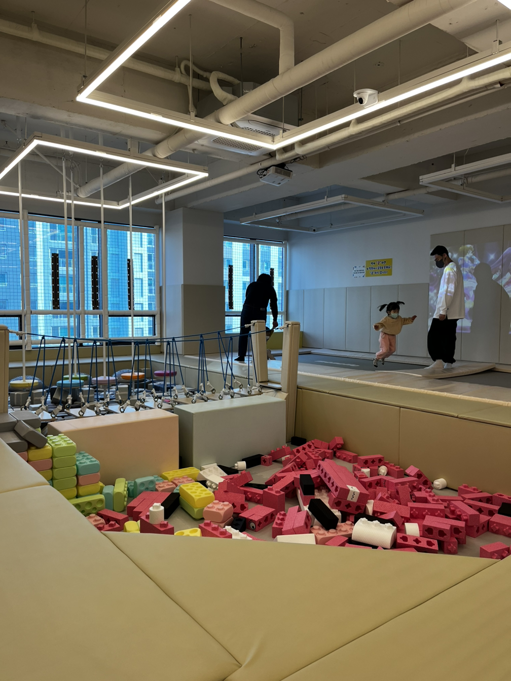 카페 내부는 다른 대형 키즈카페들에 비해 아담했다. 그래도 트램펄린에 소꿉놀이, 낚시존, 편백나무블록존, 볼풀공간, 미끄럼틀, 정글짐, 클라이밍, 장애물 건너기 등등 아담했어도 있을 건 다 있었던 알짜배기 공간이었다.