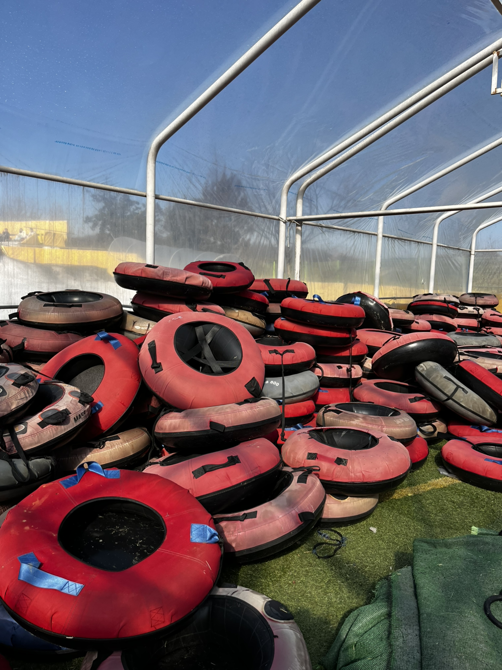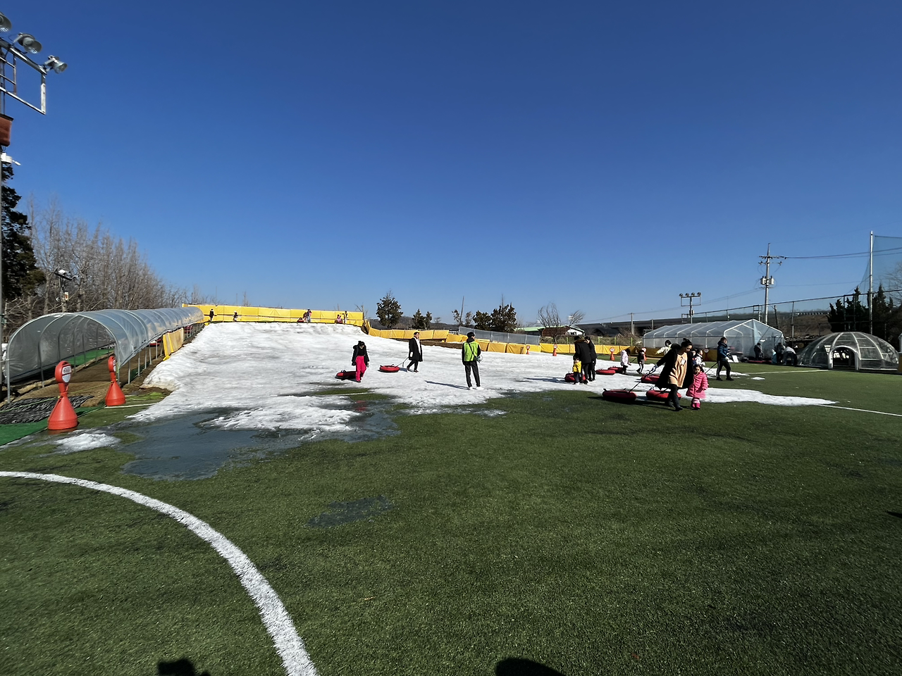 그런데 기우였다. 아침 일찍부터 부지런 떨어서 그랬는지 눈썰매장에 사람이 생각보다 많지 않았다. 눈썰매 언덕이 처음에 탔던 것보다 높지 않아서 왔다 갔다로 시간을 뺏길일이 많이 없을 것 같았다. 또 눈썰매를 많이 재밌게 탈 수 있겠단 생각에 설렜다. 처음 탔을 때와 똑같은 튜브로 된 썰매였기에 아이가 재밌게 탈 줄 알았다. 그렇게 내가 생각한 대로 되면 참 좋았으려 만.