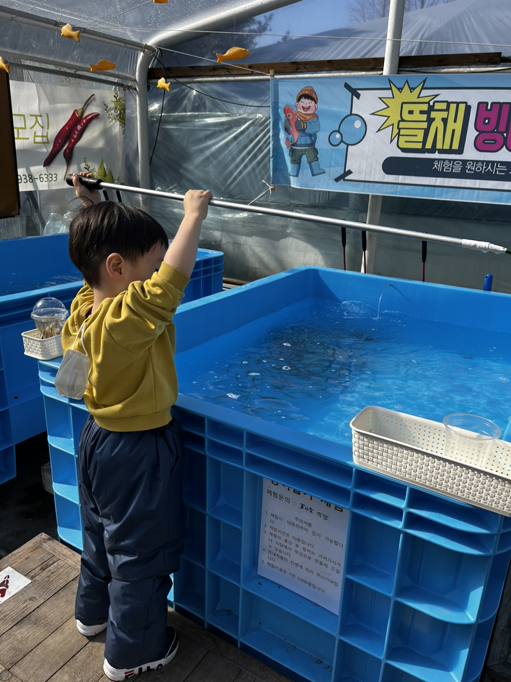 “아들아, 제발 한 번만 타보자! 한번 타보면 분명 재밌을 거야 “라고 간곡히 타일러서 타보려고 했지만 발버둥 치는 아들 녀석은 감당이 안 됐다. 결국 튜브썰매는 그냥 내려놓고 아들 녀석과 함께 올라왔던 길로 다시 내려갔다. 그렇게 아쉬움 가득 눈썰매장을 빠져나온 후 우린 식당에 있는 빙어잡이체험을 하러 갔다. 우리가 여길 왔던 두 번째 이유기도 했다. 낚시놀이를 좋아하고 물을 좋아하는 아들 녀석에겐 어쩌면 눈썰매장보다 빙어잡이체험을 더 좋아할 수도 있겠단 생각이 들었다.