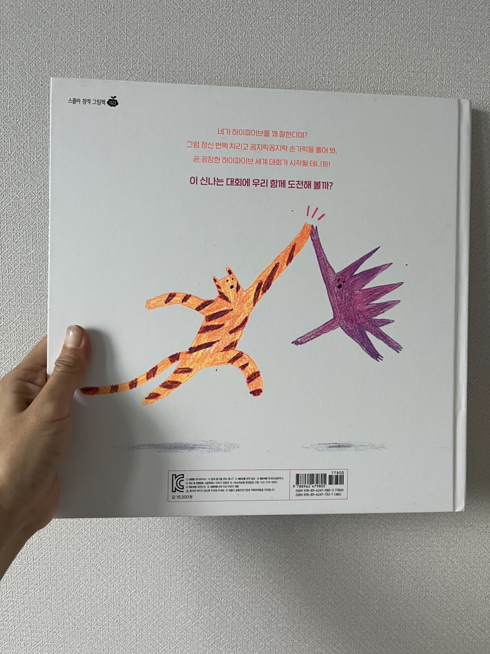 책 제목 다 함께 즐거울 준비됐니? 하이파이브에서 이 책을 읽고 같이 하이파이브를 하면서 아들과 즐거운 시간을 보냈다. 손을 흔들며 인사하는 게 서툰 우리 아들 녀석의 인사가 되어주기도 하고, 때로는 아들 녀석이 낯가림이 심한 상황에 맞닥뜨렸을 때 마치 주문처럼 외치는 하이파이브. 처음에 이 책을 추천해 주실 때도 글을 너무 다 읽으려 하지 말고 하이파이브를 놀이처럼 해서 읽어주면 재밌게 다가올 수 있을 거라고 하셨는데 정말 그랬던 것 같아 읽는 내내 좋았던 책이었다. 이 책은 멘토님의 말처럼 우리 아들 녀석한테 뿐만 아니라 훗날 유치원이나 어린이집 같은 곳에 가서 다른 여러 아이들에게도 같이 어색함을 풀 겸 친해지고 다가가고 싶을 때 놀이처럼 읽어줘도 좋을 것 같은 책이다.