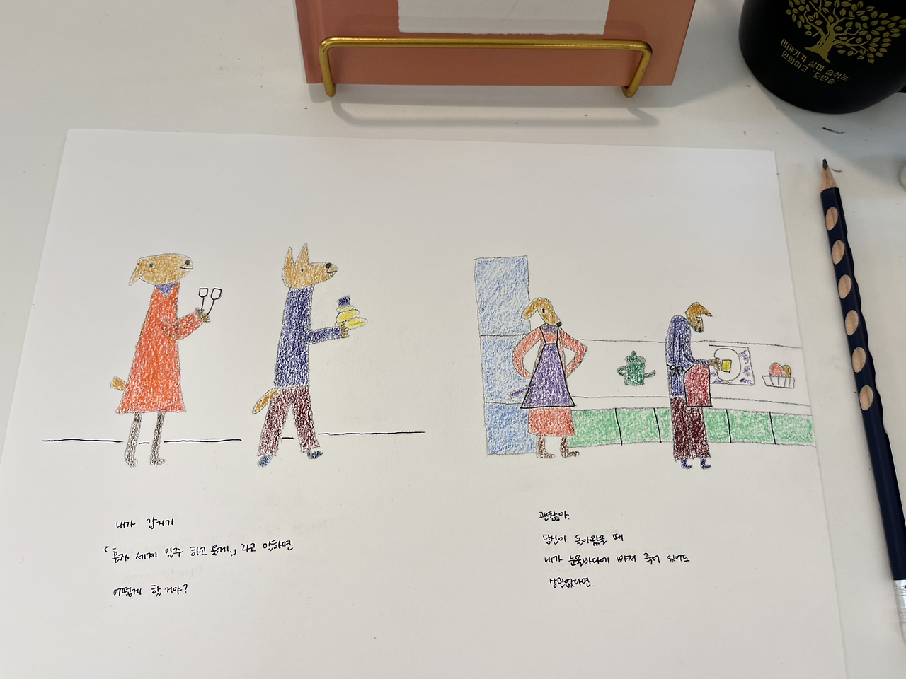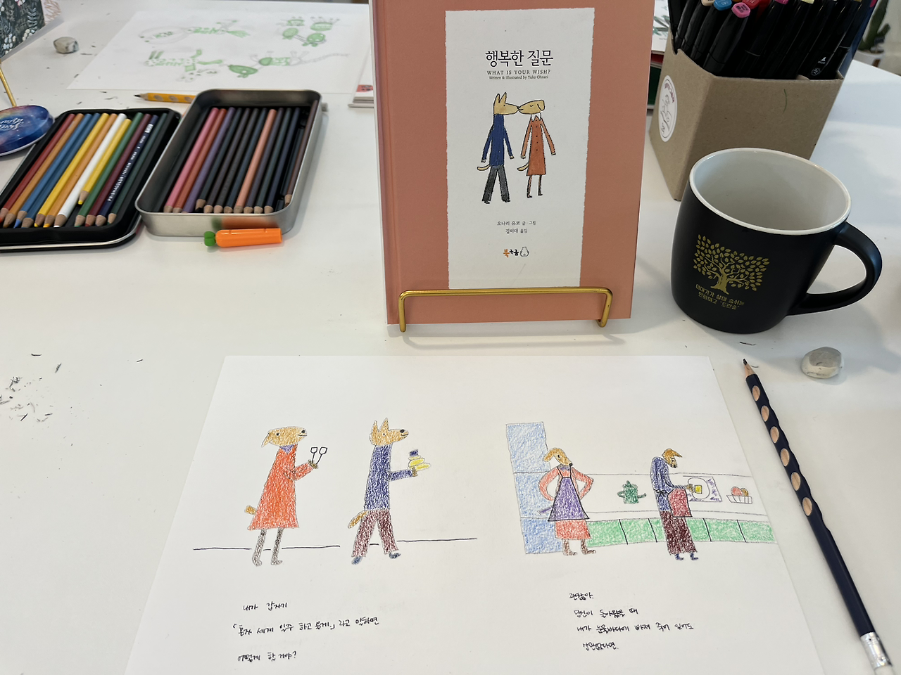 그림책필사모임을 하는 날이었다. 그림책필사모임은 책방에서 원하는 그림책을 집어서 그 자리에서 읽어본 후 감명 깊은 내용을 도화지에 그려 넣고, 글을 적는 시간이었다. 이 시간이 좋은 이유는 내가 집에 있는 그림책을 가져가는 것이 아니라 갑작스럽게 끌리는 그림책을 그 자리에서 바로 읽어본 후 서툰 그림실력으로 인상 깊은 장면을 도화지에 그려 넣고, 색칠을 하고, 인상적이었던 문장을 적어내는 것. 정해지지 않고, 갑작스럽다는 점에서 서프라이즈를 유독 좋아하는 내게 참 딱인 그런 모임이었다. 항상 집에서 책방으로 출발하기 전 ’ 오늘은 이 책을 읽고 그려야지 ‘라고 생각하는데 막상 책방에 도착하면 다른 책을 보고 있는 나다. 그래서 이번에 선택했던 그림책은 <행복한 질문>이라는 그림책이었다.