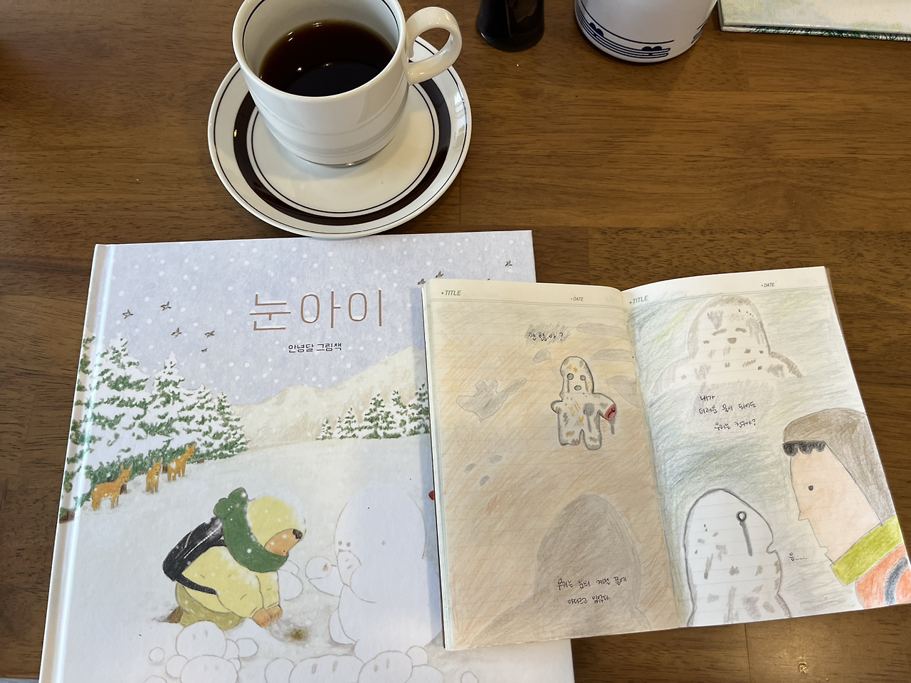 아들을 신경 쓰느라 정신없을 것 같은 내가 들고 갔던 그림책은 <눈아이>였다. 원래는 그림모임에서 나의 기억하고 싶은 일상을 그려냈지만, 이번만큼은 그림책필사를 했다. <눈아이>를 보면서 소년과 눈사람의 우정이 장면마다 드리워져 모든 장면이 다 좋지만, 특히나 나는 눈사람이 녹아내리면서 소년에게 자신이 더러워져도 친구냐고 묻는 장면이 가장 뭉클하다고 해야 할까? 소년과 눈사람을 보는데 육아를 하고 있어서 그런지 엄마로서 나와 아이가 떠올랐다. 아이가 만약 “내가 무슨 짓을 하던 날 사랑해 줄 거야?”라고 물어본다면?을 상상했다. 그래서 진짜 사랑하면, 진짜 좋아하면 더럽던 깨끗하던 무조건 좋은 거라는 걸 눈사람에게 달려가서 말해주고 싶었다. 그런데 이 말을 해주기 전에 소년의 짧고도 묵직한 “응”이라는 대답에서 모든 걸 말해주고 있었다. 그러기에 눈사람도 눈물을 흘렸던 거겠지.