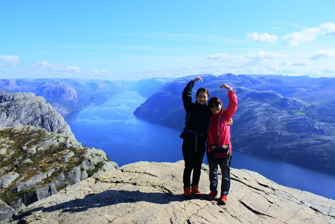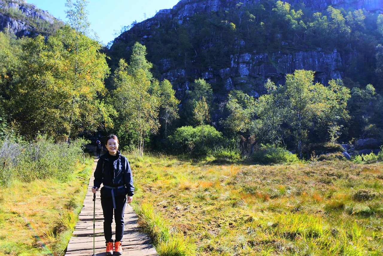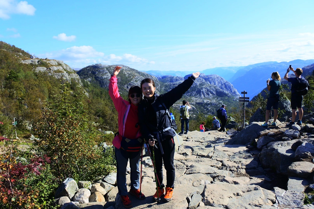 그리고 다음날 우린 두 번째 트레킹인 프레이케스톨렌 트레킹을 도전했죠. 이곳은 엄마도 잘 올라가실 수 있을 정도로 난이도가 쉬웠어요. 엄마도 “확실히 전날보다 여기가 더 쉽네”라고 여유를 보이셨죠. 이날은 저의 생일이기도 했는데 엄마는 “생일날 미역국도 못 끓여줘서 미안해”라고 하셨지만, 이곳에 함께 와 있는 것만 해도 저는 최고의 생일선물이었어요. 그런데 엄마는 사부작사부작 오르시더니 정상인 펄핏락까지 성공했어요.