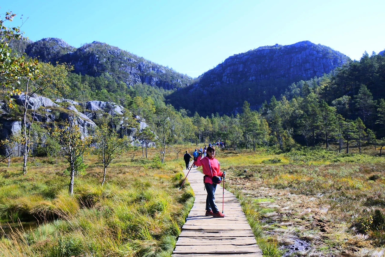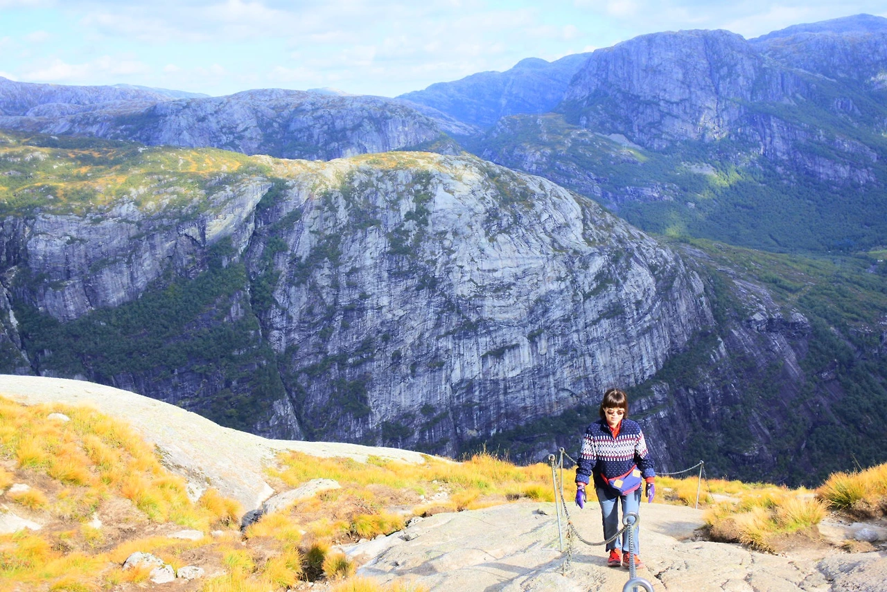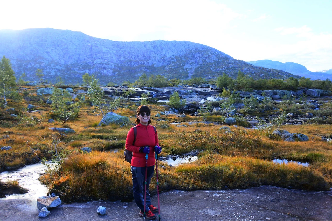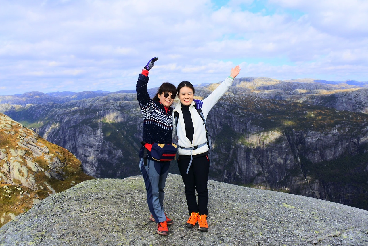 그리고 다음날 우린 두 번째 트레킹인 프레이케스톨렌 트레킹을 도전했죠. 이곳은 엄마도 잘 올라가실 수 있을 정도로 난이도가 쉬웠어요. 엄마도 “확실히 전날보다 여기가 더 쉽네”라고 여유를 보이셨죠. 이날은 저의 생일이기도 했는데 엄마는 “생일날 미역국도 못 끓여줘서 미안해”라고 하셨지만, 이곳에 함께 와 있는 것만 해도 저는 최고의 생일선물이었어요. 그런데 엄마는 사부작사부작 오르시더니 정상인 펄핏락까지 성공했어요.