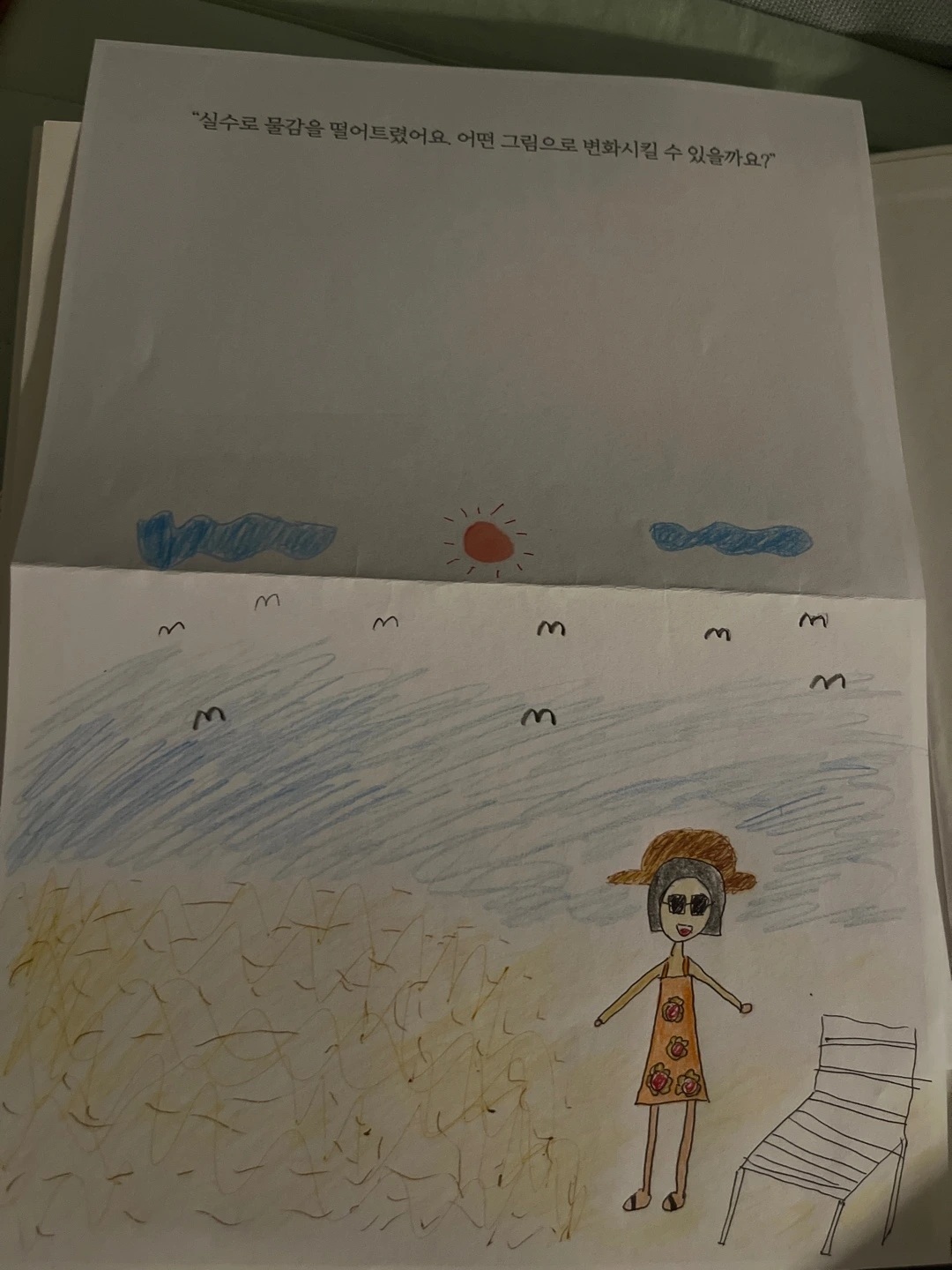 온라인그림책모임에서 독후활동으로 각자 종이에 주황색 점을 실수로 떨어뜨렸을 때 무엇을 표현할지 나눠보는 시간을 가졌다. 각자가 생각하는 게 다 달랐다는 것도 신기했다. 처음엔 뭘 표현해야 할지 막막했는데 갑자기 태양이 떠올랐고, 해변가의 반짝이는 물과 모래사장이 떠올랐다. 해변가에서 더위를 즐기는 나의 모습을 표현했다. 점 하나 흘린 걸로 이렇게 멋진 생각을 할 수 있고, 이 생각이 작품이 될 수 있다는 점. 성장의 밑거름이 되는 실수가 하고 싶어 진다.