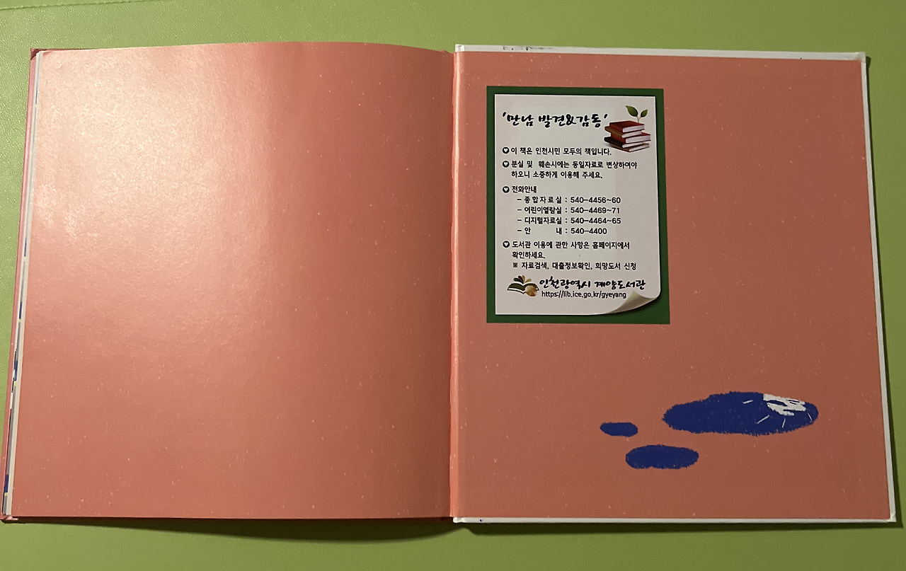 뒷면지를 보면 짐작건대 비가 개고 난 후 물 웅덩이가 생긴 모습을 그린 것 같은데 이는 아이의 상태를 인지하고 아이에게 어떻게 해줄지 나름의 실마리를 찾은 느낌이랄까. 나 또한 아들을 지켜보면서 안 되겠다 싶어 고민 끝에 다니던 일을 그만두고 아이와 함께 지내면서 아이에게 여러 자극을 주고 아이가 변화되는 모습을 지켜볼 때마다 비록 속도가 많이 더디지만 아이는 그래도 아이 나름의 속도로 성장하고 있음에 가슴이 벅차올랐고, 희망도 보였다.