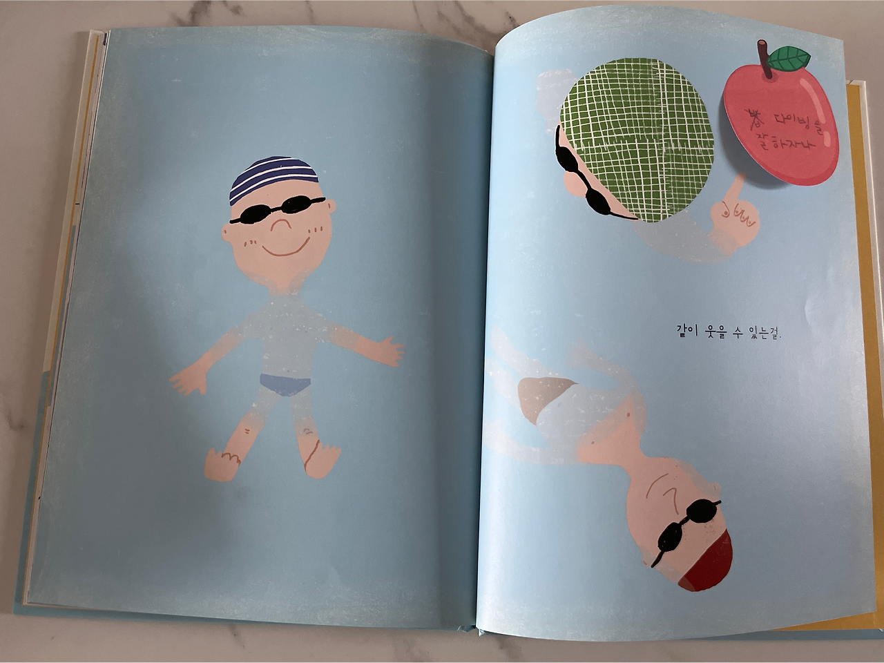 이 책을 처음 만났던 건 그림책필사모임을 진행하는 작은 서점에서였다. 그림책을 펼쳐보니 마지막에 뛰어내린 장면에서 이렇게 예쁜 사과모양의 포스트잇으로 “다이빙을 잘하잖아”라고 쓰여있었는데, 이건 책을 봤던 누군가가 이렇게 한 걸까? 아니면, 그림의 손짓도 그렇고 작가가 의도한 것이었을까? 살 땐 없었던 것 같았는데 신기했다.