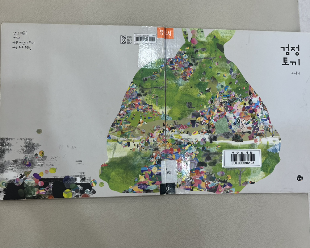 원래의 이 책의 표지는 검정토끼가 그려져 있다. 그러나 도서관에서 빌린 책이라 그런지 검정토끼가 그려진 표지는 없고, 초록색의 알록달록한 것들로 덮여있는 토끼가 그려져 있는 그림이다. 표지가 있었다면 더 좋았겠지만 여러 사람이 함께 보는 책이니만큼 그럴 수 없었던 점이 아쉽지만 이해는 됐다.
