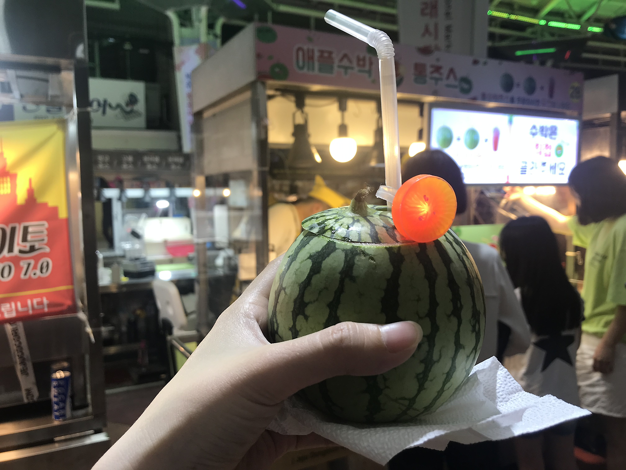 그러고 나서 제주 동문 야시장을 투어 했다. 먹고 싶었던 진짜 맛있다고 입에 침이 마르게 추천을 받았던 전복 버터 밥과 제육볶음의 만남인 제주 동문 야시장의 화제의 요리인 돈복이는 아쉽게도 우리가 도착했을 때 재료가 소진되어 맛보는데 실패했다. 눈물을 삼키며 돌아섰던 나는 눈에 보이던 시원하고, 달콤한 수박주스를 마시며 축복이와의 첫 제주여행을 마무리했다. 함께 있던 동료들이 어떻게 수박주스 하나에 이렇게 기분이 오락가락할 수 있는 거냐고 참 신기하다고들 했다. 나도 참 나 자신이 신기했다. 수박주스를 보며 그렇게 함박웃음을 지었던 나 자신이. 이건 모두 다 축복이 너와 동료들이 있었기에 가능하지 않았을까 싶다. 그래서 그랬는지 아빠가 없어도 아빠의 빈자리가 느껴지지 않았던 여행이었다.