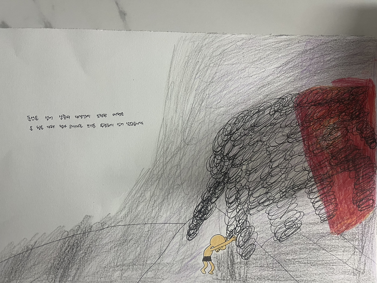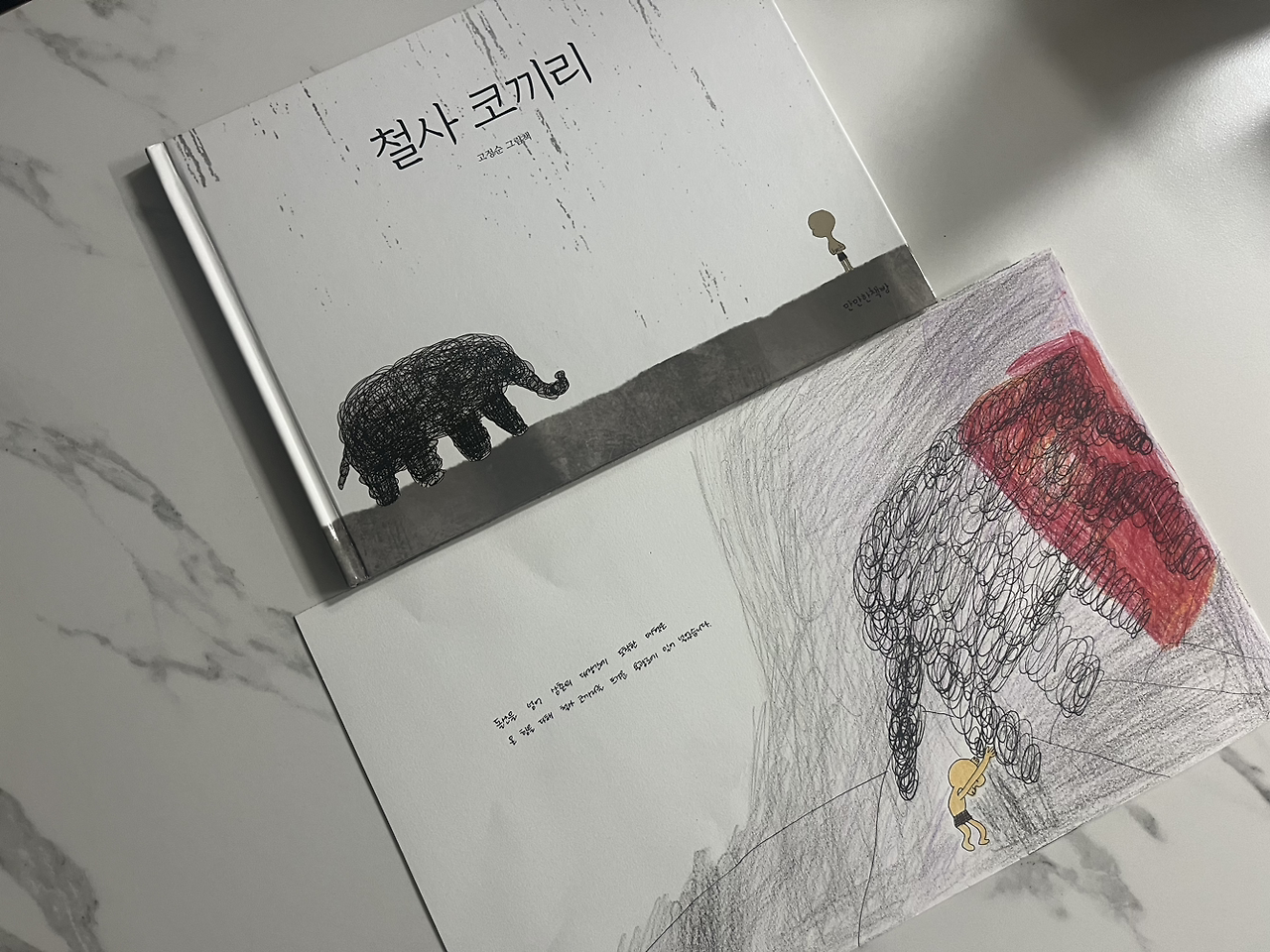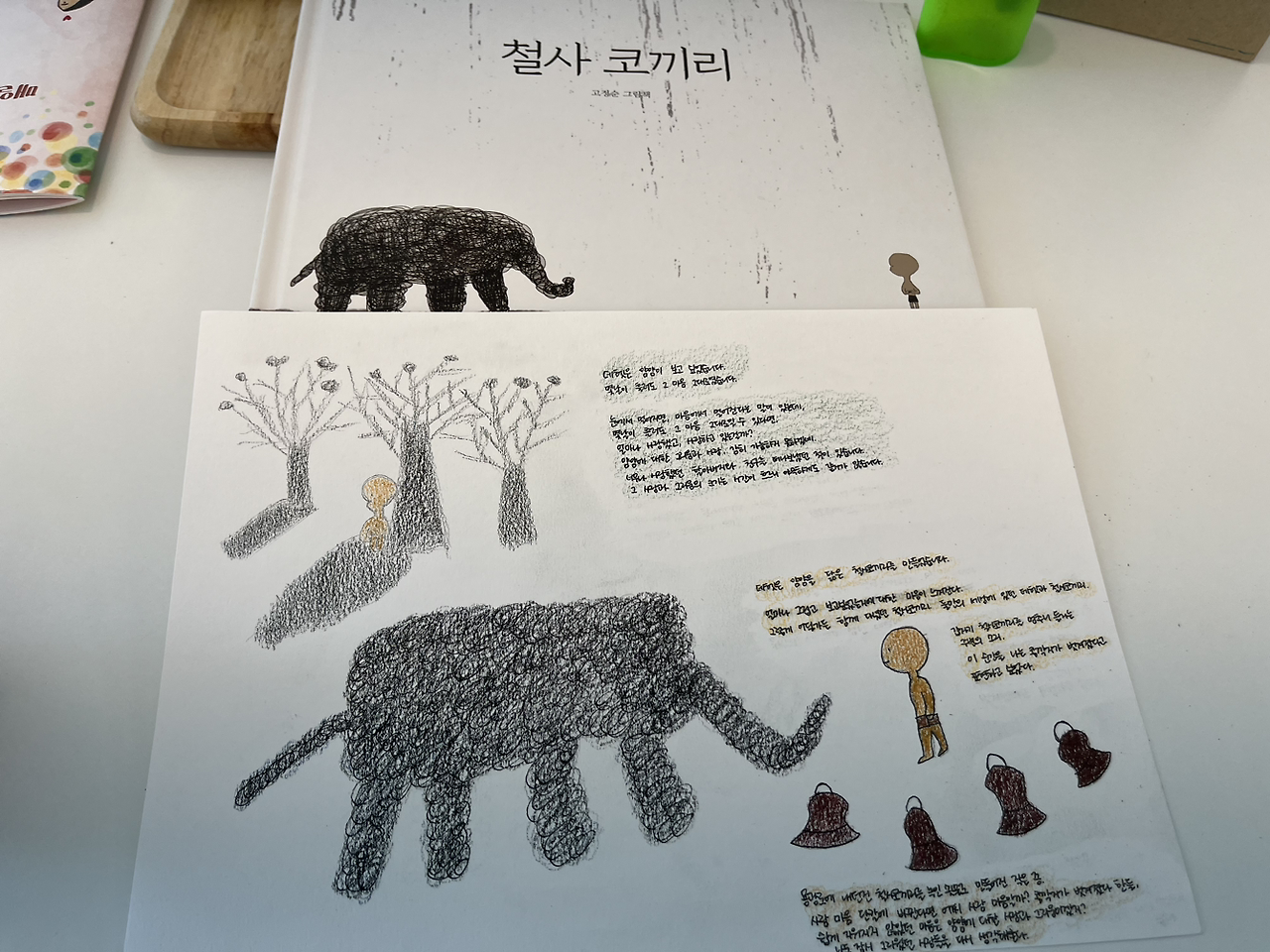 이 책을 처음 봤을 때는 얌얌을 잃은 슬픔이 얼마나 컸을까? 에 초점을 맞춰 얌얌을 그리워하고 철사코끼리를 만들어 함께 다녔던 부분을 인상 깊게 봤었다면 이번에 다시 봤을 때는 이별에 대한 그리움과 슬픔에서 현실을 직시하고 그 슬픔에 빠져나오려는 부분인 철사코끼리를 용광로에 내던지는 장면이 더 깊게 와닿았다. 그 사이 내 마음도 슬픔 앞에서 더 단단해진 걸까?