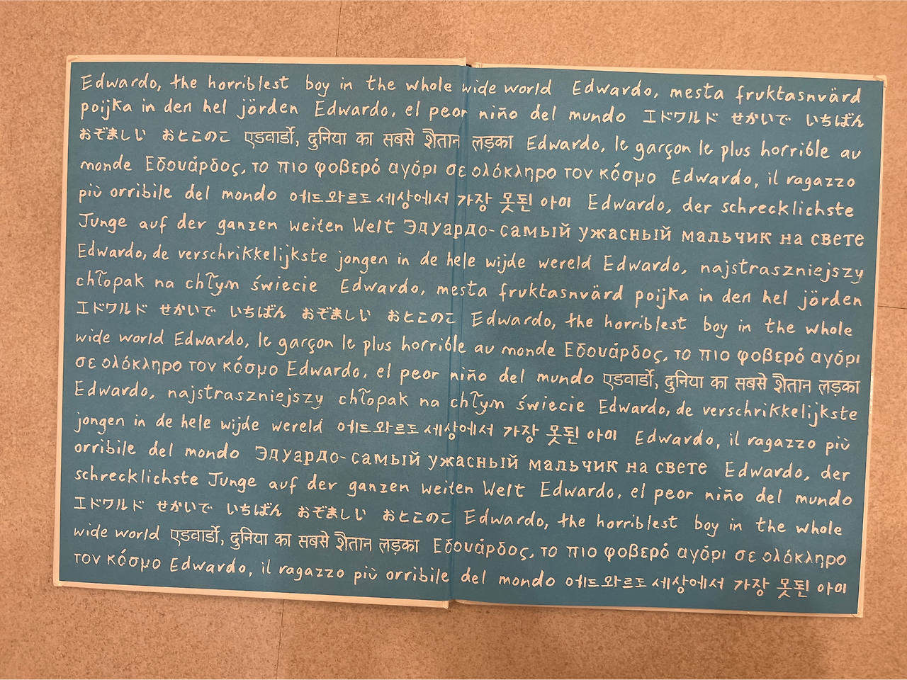 앞면지에는 전 세계언어로 “에드와르도 세상에서 가장 못된 아이”가 쓰여있다. 그리고 뒷면지도 동일하게 쓰여있다. 개인적인 생각인데 ’뒷면지에는 “에드와르도 세상에서 가장 사랑스러운 아이”라고 쓰여있었다면 어땠을까?‘라는 생각을 해봤다.