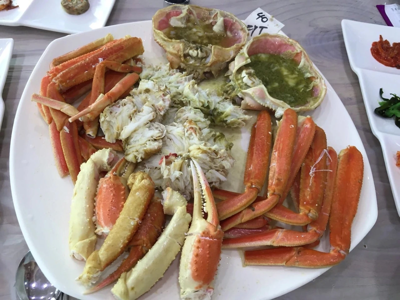 먹는 걸 좋아하는 우리 커플은 속초에 왔으니 유명한 대게를 먹고 가야 하지 않겠느냐에 서로의 의견이 일치했었다. 역시 우리는 먹는 걸 좋아하는 먹보 커플이었다. 그래서 동명항은 원래 가려던 참이었고, 그 주변에서 가까운 속초의 인기 명소인 영금정을 들르게 됐던 것이었다. 영금정은 크고 넓은 바위들이 깔려있어 파도가 바위에 부딪치면 신묘한 율곡이 들려 이 소리를 신령한 거문고 소리와 같다는 데에서 유래한다고 하였다. 동명항에서 대게를 먹기 전 먼저 영금정부터 둘러보았다. 과연 왜 이곳이 속초에서 설악산과 함께 인기 명소인지 알겠더라. 자연경관이 아름다웠다. 그렇게 바다도 보고, 정자도 올라가 보고 정자 위에서 경치도 바라본 뒤에 내려와서 동명항을 갔다. 동명항까지는 거리가 가까워 걸어가기에 충분했었다. 드디어 기다리고 기다렸던 대게를 먹는 시간이었다. 살이 꽉 찬 대게 한 마리와 게딱지에 쓱싹쓱싹 비벼 먹는 날치알 볶음밥은 맛있어서 어떻게 먹었는지도 모르게 순식간에 사라졌다. 이런 경우를 바로 "게눈 감추듯 사라진다."라고 말하는 건가.