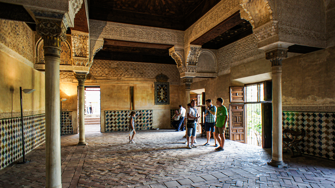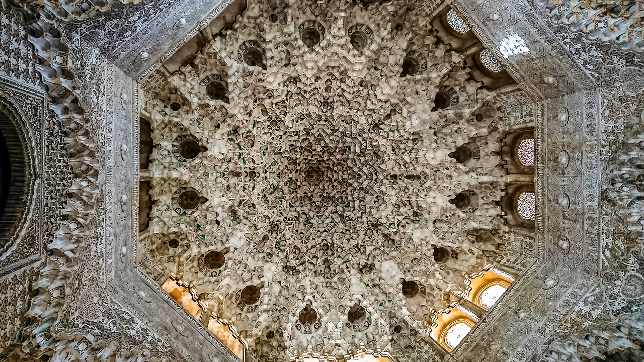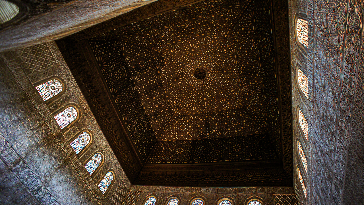 코마레스 궁전 Palacio de Comares 내 코마레스 타워 Torre de Comares 에서는 알람브라 궁전에서 가장 큰 공간이자 술탄의 알현실인 대사의 홀 Salón de los Embajadores 을 만날 수 있습니다. 이곳엔 이슬람의 화려한 치장 벽토 Stucco 와 세라믹, 그리고 거대한 돔형 목조 천장이 자리하는데요. 천장은 8천 여 개의 나무 조각으로 구성되며, 서로 빈틈 없이 연결된 조각들이 이슬람의 하늘을 기하학적 형태로 표현하고 있습니다.