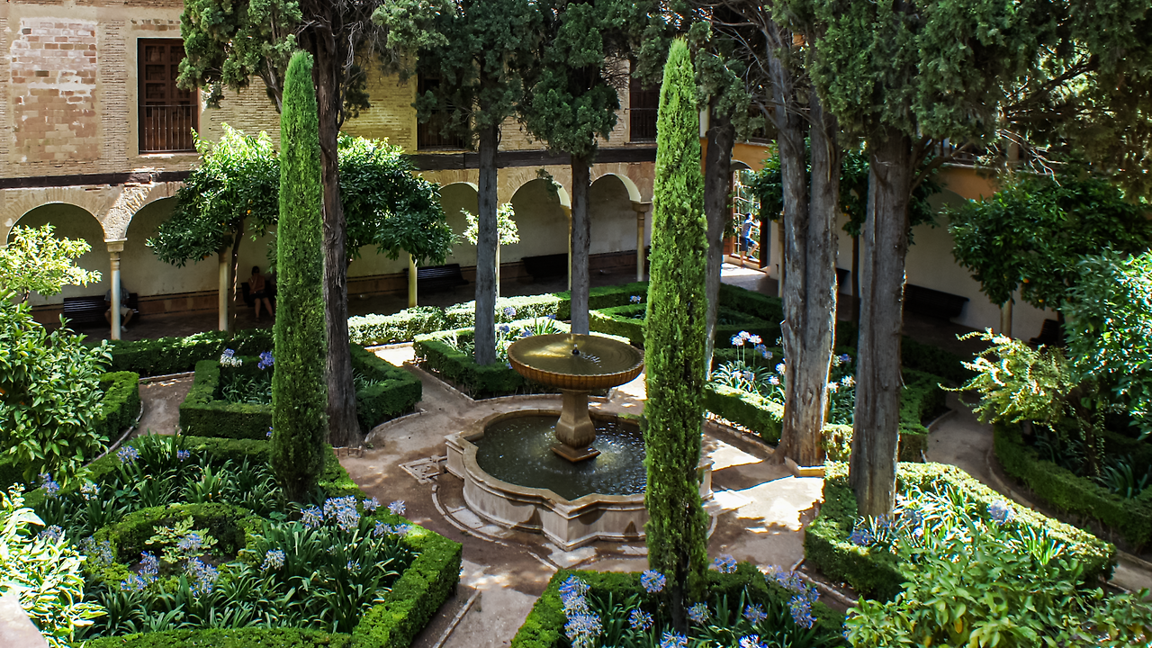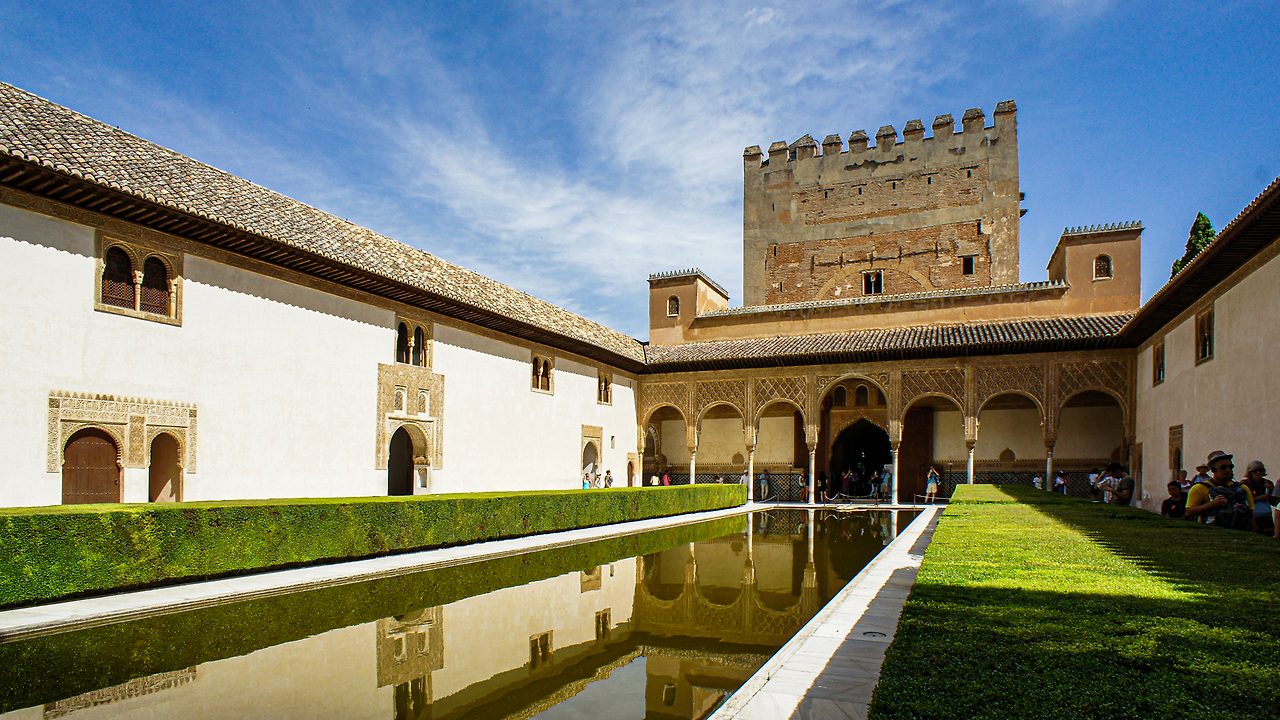 코마레스 중정 Patio de los Arrayanes / Patio de Comares 의 직사각형 연못에 비치는 코마레스 타워는 마치 거울에 반사된 듯 그 형태가 뚜렷합니다. 이는 코마레스 궁전을 더욱 아름답게 하는 요소 중 하나로, 여기엔 끊임없이 순환되는 연못을 잔잔하게 만드는 이슬람의 뛰어난 건축술이 숨어 있습니다.