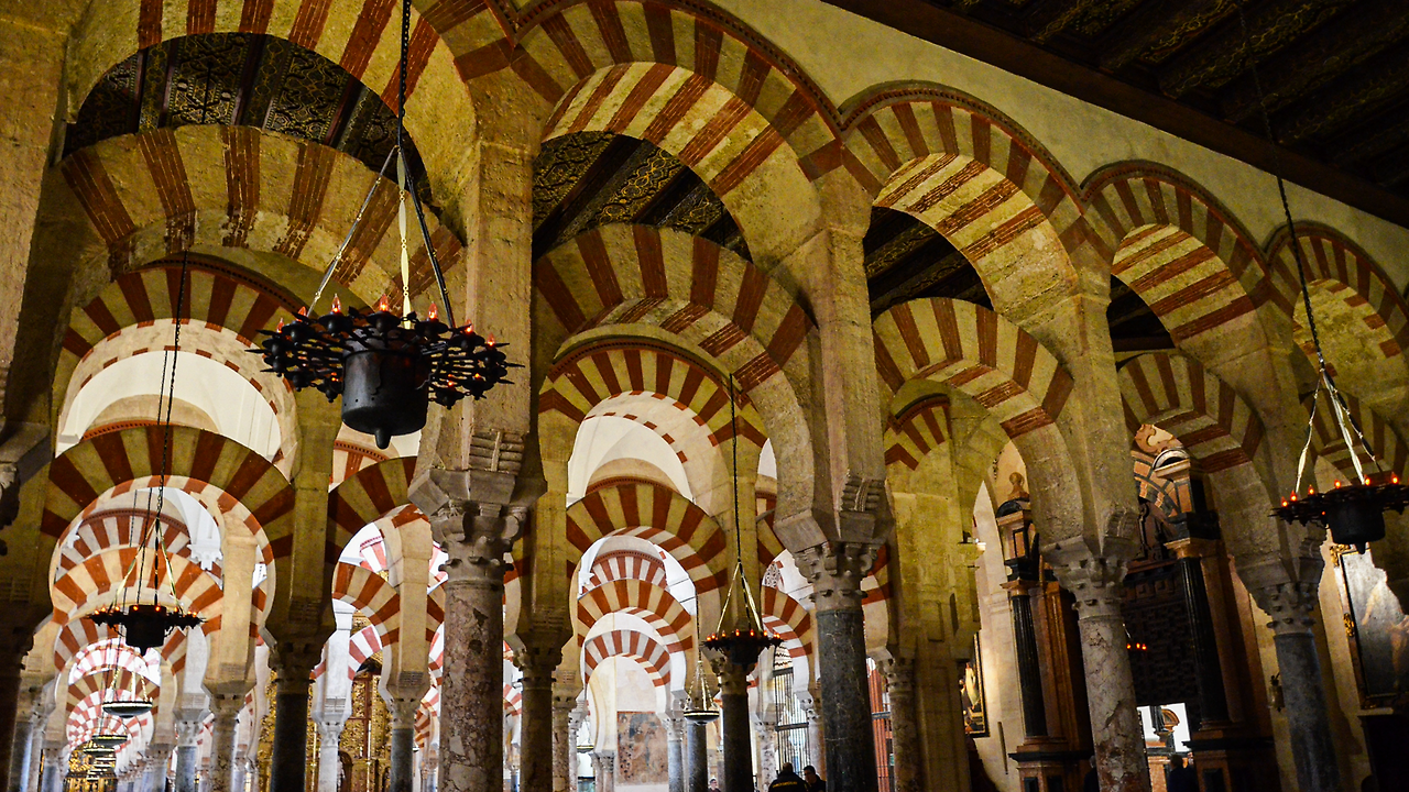 메스키타의 상징은 붉은 돌과 흰 돌을 번갈아 사용한 이중 아치와 기둥입니다. 856개의 기둥엔 이오니아 Ionic order, 도리아 Doric order, 코린트 Corinthian order 양식의 주두 柱枓 가 다양하게 분포되어 있는데, 이는 과거 코르도바에 산재한 로마 및 서고트 건축물의 기둥을 메스키타 건축에 재활용했기 때문입니다. 하지만 이 기둥들이 원하는 천장 높이만큼 충분히 길지 않았기 때문에 당시로서는 상당한 건축적 혁신이라 할 수 있는 이중 아치를 건설하게 되었습니다. 아래쪽 말굽 형태의 아치는 지지대 역할을, 위쪽 반원형 아치는 지붕을 떠받드는 역할을 합니다.