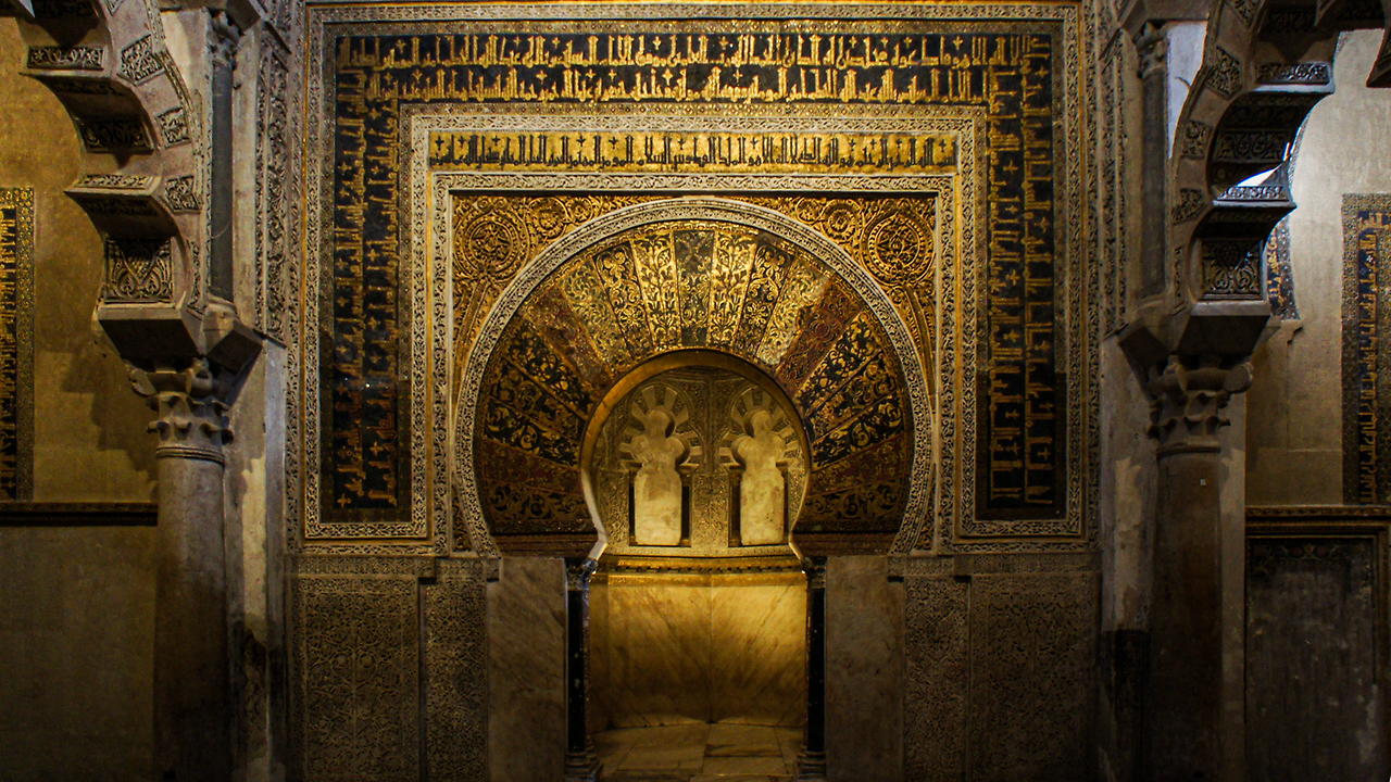 미흐랍 Mihrab 은 무슬림이 올바른 방향으로 예배를 드릴 수 있도록 이슬람 성지 메카 Mecca 방향을 가리키고 있는 모스크의 핵심 공간입니다. 무데하르 Mudéjar 양식의 열쇠구멍 형태를 띈 메스키타의 미흐랍에는 흥미로운 역사가 남아 있습니다. 칼리프 알 하캄 2세 Al-Hakam II 는 메스키타의 미흐랍을 화려한 황금 장식으로 꾸미길 원했습니다. 이에 당대 최고의 모자이크 기술을 보유한 동로마 제국 황제에게 전문 모자이크 기술자의 지원을 요청하는 서한을 보냈는데, 황제는 그에 대한 회신으로 약 1,600kg의 모자이크 조각과 모자이크 장인을 함께 선물로 보냅니다. 이 모자이크 장인은 후우마이야 왕조의 장인들이 스스로 모자이크 작업을 수행할 수 있을 만큼 훈련을 시켰고, 그 결과 화려한 황금 모자이크로 뒤덮인 메스키타만의 아름다운 미흐랍이 완성될 수 있었습니다.