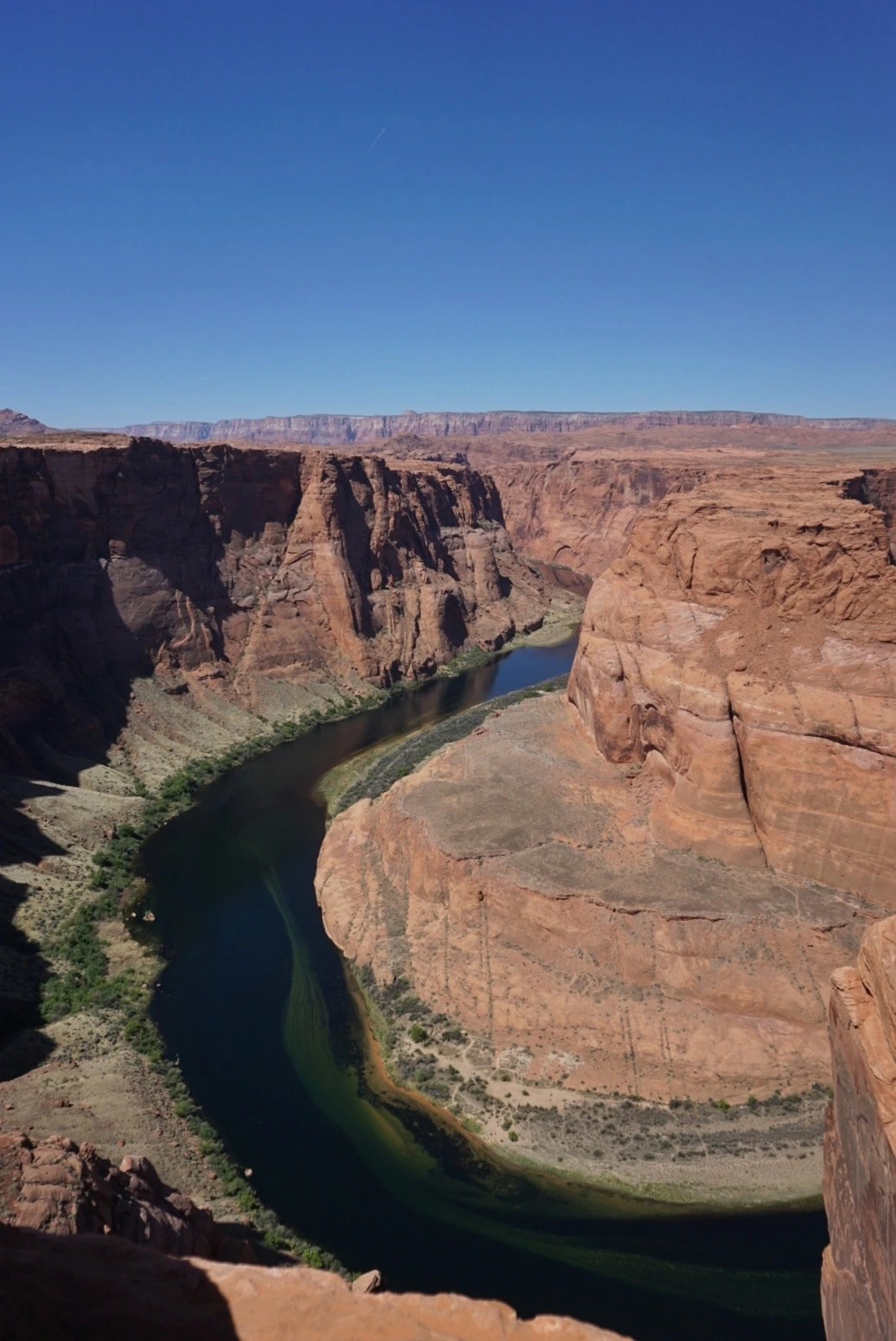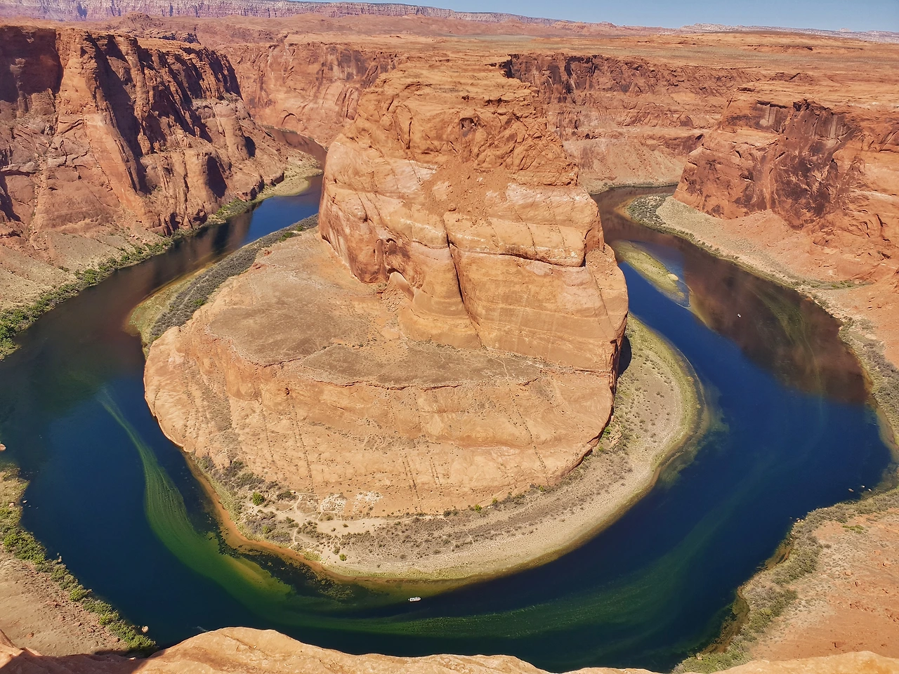 말발굽 모양의 거대한 바위를 중심으로 콜로라도 강이 원형으로 흐르며 휘감고 있었다. 이렇게까지나 깊게 바위를 깎기까지 대체 얼마나 오랜 세월이 필요했을까. 진한 코발트블루 색을 지닌 강에서는 그 물결을 따라 초록빛 띠가 춤추고, 그 규모를 비교해주듯 개미만큼 작은 보트 하나가 강물을 지나가고 있었다. 웅장함 안에 담겨있는 그 섬세한 색의 조화가 눈이 부시게 아름다웠다.
