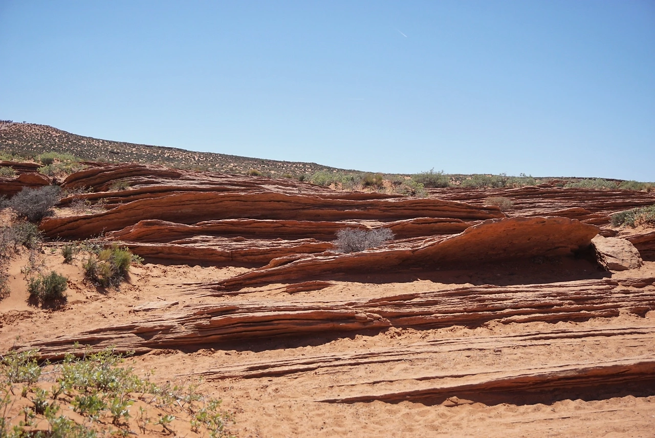 우리는 도저히 눈을 뜰 수 없는 오렌지색 땡볕 아래에서 오렌지색 모레 언덕을 무겁게 걸었다. 가는 길은 잡초들만 무성한 황무지에 가까웠기에 이 근처에 그런 경관이 있다는 것이 믿기지 않았다. 그래도 말발굽 협곡을 실제로 볼 수 있다는 희망에 가득 찬 우리는 힘을 냈다. 그렇게 모레 길을 지나고 나니, 얇은 빵을 겹겹이 쌓아 만든 크레이프 케이크처럼 얇은 암석이 층층이 쌓여있는 특이한 지형이 나타났다. 그 지형을 밟으며 좀 더 걸으니 드디어 저 멀리에 푹 패여져있는 무언가가 보이기 시작했다. 여행 다큐멘터리의 연출처럼, 좀처럼 쉽게 전체의 모습을 드러내지 않는 협곡이 우리의 애간장을 태웠다.