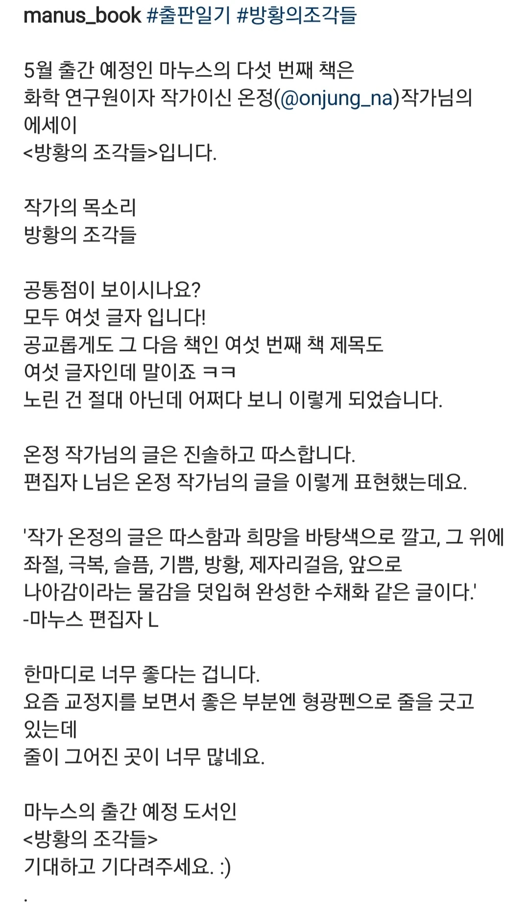 그런데 3교가 끝난 뒤 출판사 대표님께서 인스타그램에 <방황의 조각들> 관련 글을 올리시며, "요즘 교정지를 보면서 좋은 부분엔 형광펜으로 줄을 긋고 있는데, 줄이 그어진 곳이 너무 많네요."라고 써주셨다. 아, 그거 내가 간절히 바라오던 건데. 속마음을 들킨 사람처럼 뜨끔함과 뿌듯함이 동시에 밀려왔다.