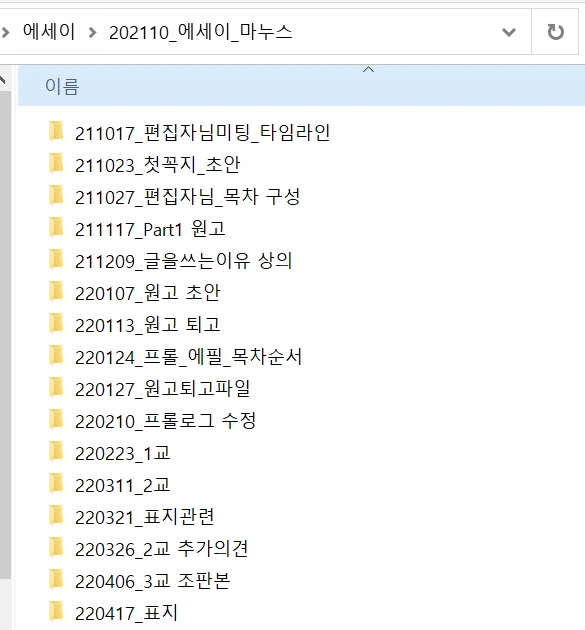 책이 세상에 나온 뒤 출간 작업 폴더를 지켜보고 있자니 마음이 뿌듯해진다. 이번 책을 준비하며 작가로서 조금 더 성장했음을 느낀다.