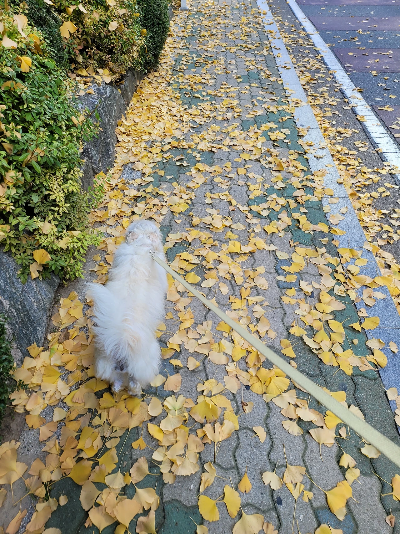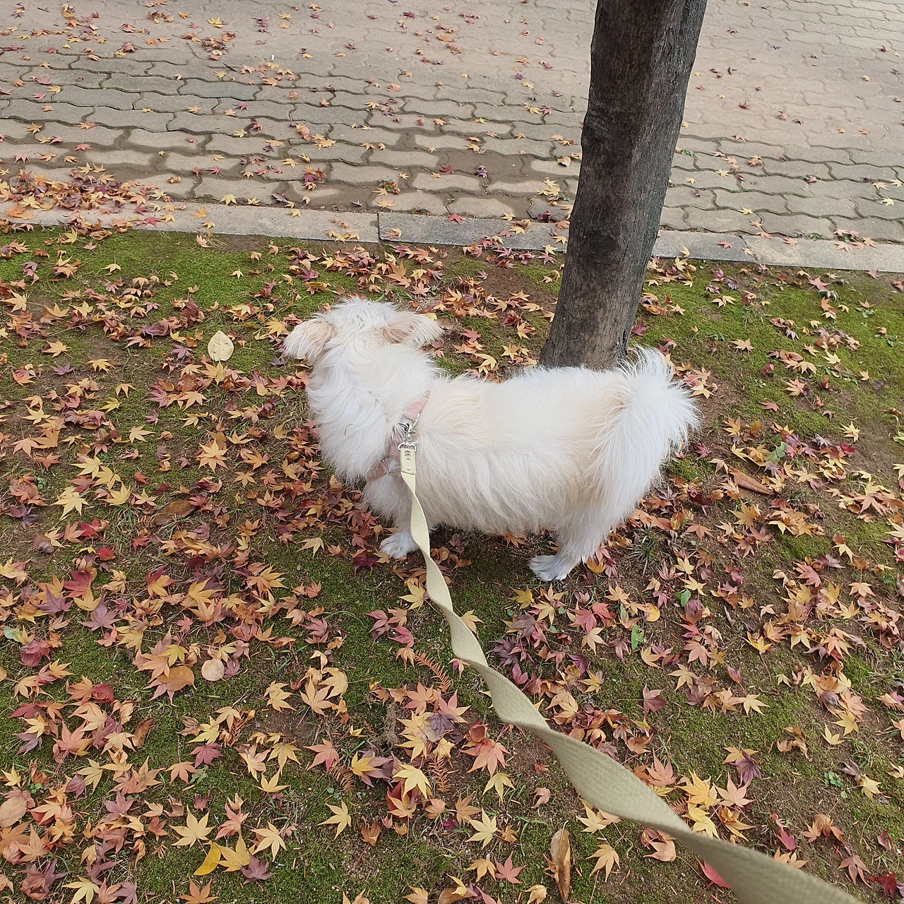 그래도 달콩이와 산책을 하다 보면 평소 무심하게 지나치던 사계절을 고스란히 느낄 수 있어서 좋다. 달콩이를 산책시키기 가장 좋은 계절은 가을이다. 더웠던 날씨가 조금씩 선선해지면서 달콩이의 털은 한껏 풍성해진다. 솜사탕처럼 부푼 채 신나게 걷는 달콩이를 보면 마치 털이 춤을 추는 것 같다. 자그마한 발바닥이 낙엽을 바삭바삭 밟는 소리가 경쾌하다. 나의 큰 발바닥으로 낙엽을 따라 밟는다. 둘이서 요란하게 바스락 악기를 연주하며 걸어간다. 가을 웜톤 달콩이가 낙엽 위에 서 있는 풍경은 조화롭다. 색채에 어떠한 이질감도 느껴지지 않는다.