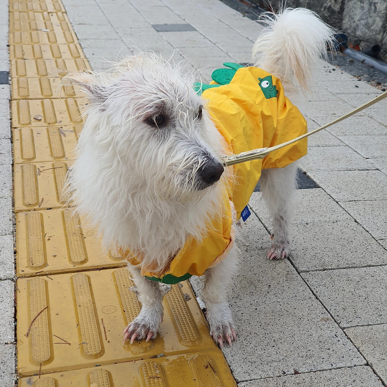 겨울과 상반되는 여름 산책은 뜻밖의 이유로 힘들다. 더워서 힘든 건 둘째 치고, 강하게 내리쬐는 햇빛 탓에 아스팔트가 가열되어 달콩이의 발바닥을 괴롭힌다. 실외배변견 달콩이의 발바닥은 겨울이고 여름이고 성할 날이 없다. 장마철에는 장마철대로 어렵다. 비가 쏟아지는 날에도 달콩이는 쉬야를 하러 밖에 나가야 한다. 달콩이에게 우비를 입히면 달콩이는 얼어버린다. 우비 특성 상 다리 부분을 조여주는 고무줄도 있고, 모자도 달려 있고 하다 보니 어색하고 불편한 탓이다. 우비 입히는 걸 여러 차례 실패한 뒤로 남편은 달콩이의 우비를 손수 수선해 주었다. 모자를 떼어주었고(머리 젖는 건 포기했다.), 앞다리 쪽의 긴소매를 돌돌 말아서 고정시킨 뒤 민소매처럼 만들었다. 비교적 뒷다리 쪽 소매는 짧길래 그대로 둔 채 입혀보았다. 그나마 걷긴 걷지만 달콩이는 여전히 고장 난 로봇처럼 뚱땅뚱땅 걷는다.