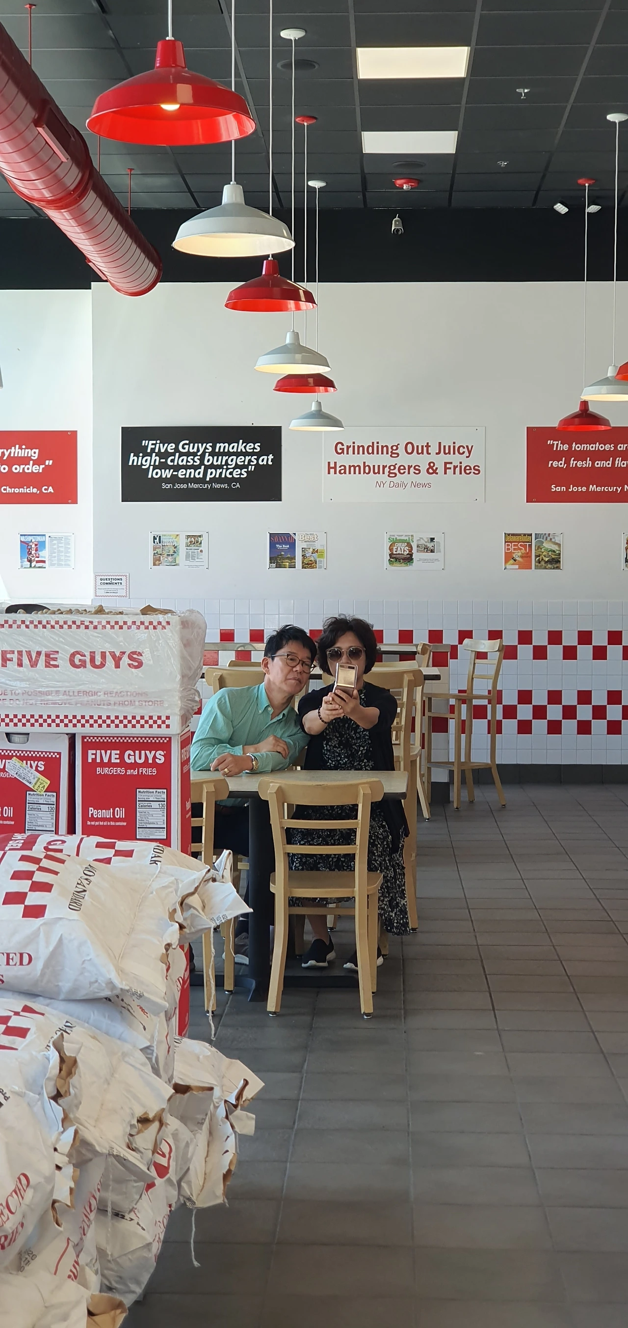 오빠의 결혼식은 숲이 무성한 Felton이라는 지역에서 열렸는데, 근처에 유명한 해변 관광지인 샌타크루즈가 있었다. 우린 오전 느지막이 숙소에서 나와 차를 타고 샌타크루즈 거리로 향했다. 본격적으로 거리를 구경하기 전, 점심을 먹으러 FIVE GUYS부터 갔다. 좋아하는 음식 1위를 물으면 주저 없이 '햄버거'라고 답하는 나와 남편인데 미국 와서 햄버거 한 번을 못 먹었으니, 보증된 맛집인 FIVE GUYS가 근처에 있는 이상 무조건 먹어주어야만 했다.