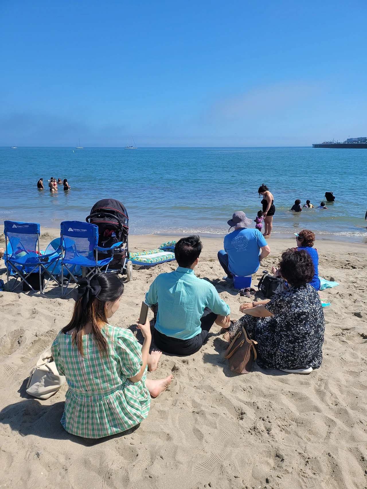거리를 한참 걸은 뒤엔 해변으로 향했다. 해변 바로 앞에는 Boardwalk라는 놀이공원이 바닷가를 따라 길쭈욱하게 자리 잡고 있었는데, 미장센 영화에 나올 법한 알록달록 놀이기구들이 예뻤다. 우리는 모래사장의 북적이는 인파 사이에 잠시 앉아 휴식을 취했다.