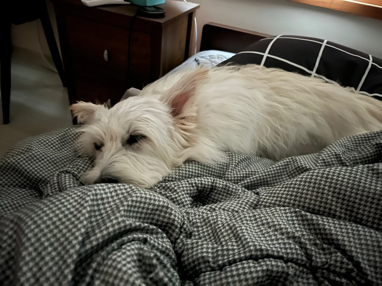 무더운 여름 동안 침대도 거의 거들떠보지 않던 달콩이가, 찬바람 솔솔 불기 시작하니 침대로 올라와 푸근한 이불 위에서 몸을 웅크리기 시작했다. 올해 부쩍 다리가 안 좋아진 달콩이가 높은 침대에 들락날락하는 게 마음에 걸렸는지, 남편은 휴일 동안 뚝딱뚝딱 침대를 개조했다. 침대가 낮아진 걸 보자마자 달콩이는 폴짝 뛰어올랐다. 우리 셋은 널찍한 침대에 누워 만족스럽게 웃었다.