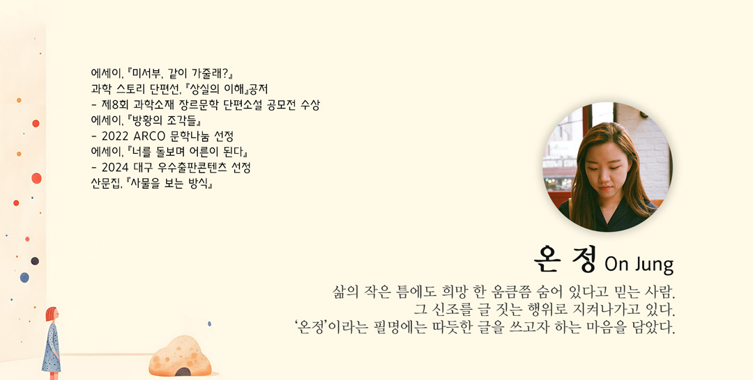 당연한 듯 흘러가는 일상도 새삼스레 붙잡아 관찰하는 사람. 그렇게 수집한 이야기를 부지런히 글로 남긴다. 더 많은 이야기가 글로 쓰여야 한다고 생각한다. 용기만 있다면 누구나 자신만의 이야기를 쓸 수 있다고 여기며, 그동안의 글쓰기 경험을 나누고자 한다.