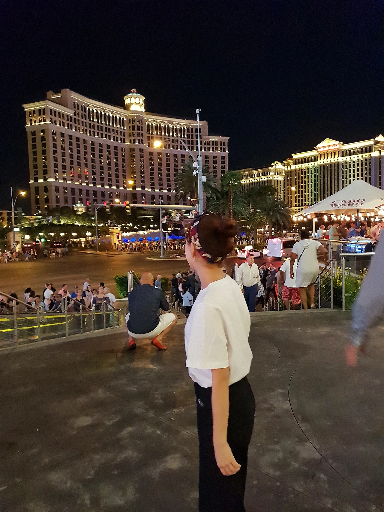 스트립에 도착한 우리는 별천지 사이를 걸었다. 혼자 왔을 때 이 거리를 끝에서 끝까지 발이 터져라 걸었던 기억이 새록새록 떠올랐다. 트립 거리를 따라 호텔들이 쭉 있는데, 주요 호텔만 구경해도 세 시간은 족히 걸린다. 호텔들에 전 세계 도시들의 명소가 담겨있기 때문이다. 예컨대 ‘뉴욕뉴욕 호텔’의 자유의 여신상과 브루클린 브릿지라든지, ‘패리스 호텔’의 에펠탑과 개선문, 베네치아의 모습을 재현해 놓은 ‘베네시안 호텔’, 또 이집트 피라미드 모형을 재현해놓은 ‘룩소 호텔’ 등이 있다. 모두 실제 건축물만큼의 품질을 기대할 수는 없지만, 이 작은 도시에서 세계를 구경할 수 있다는 점은 꽤나 흥미롭다.