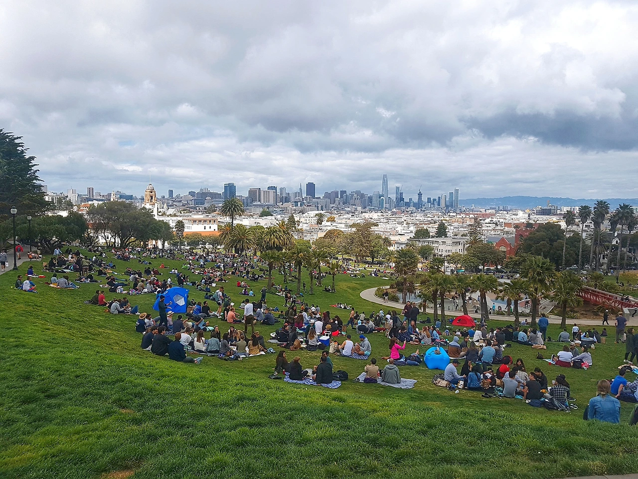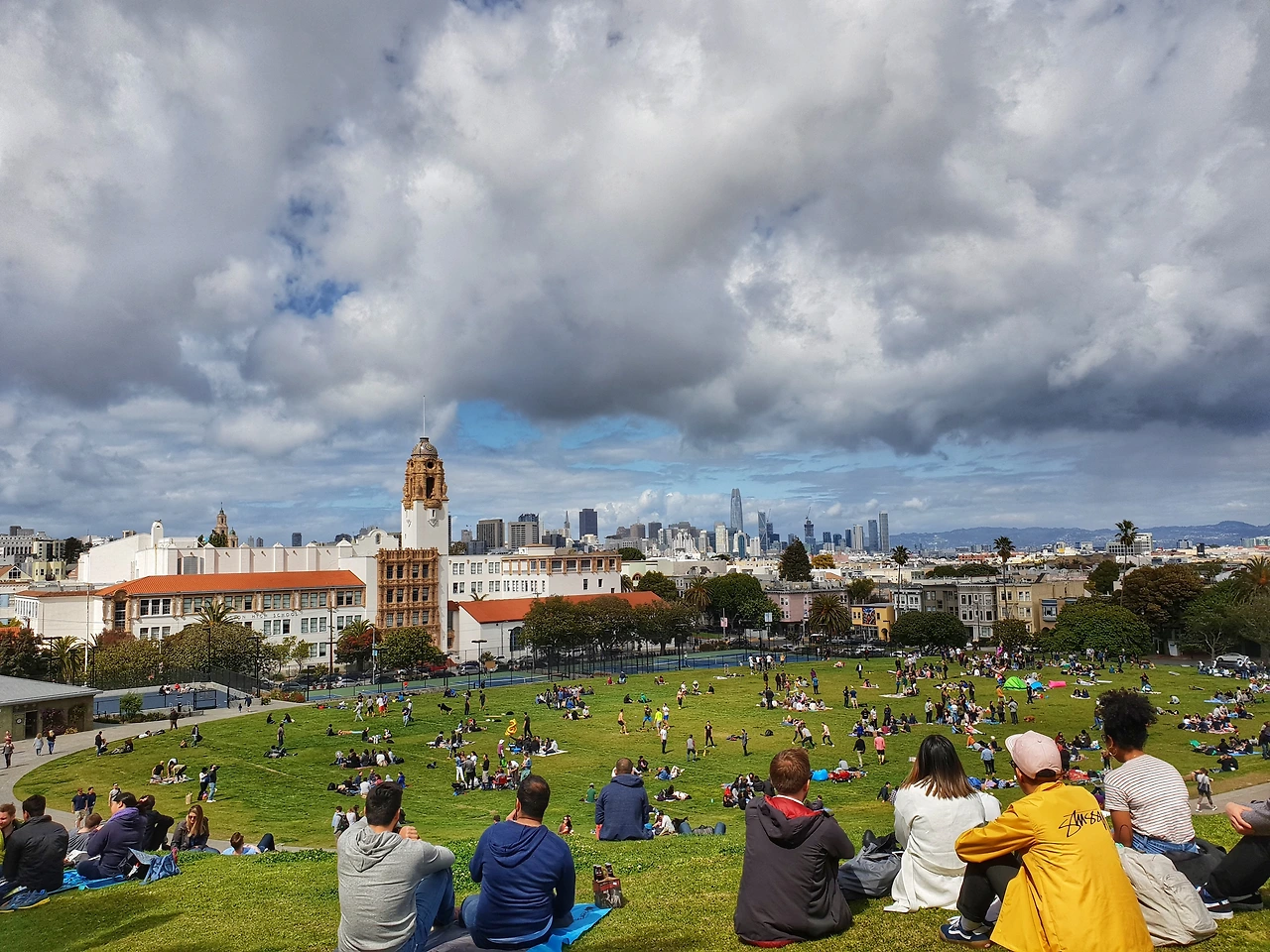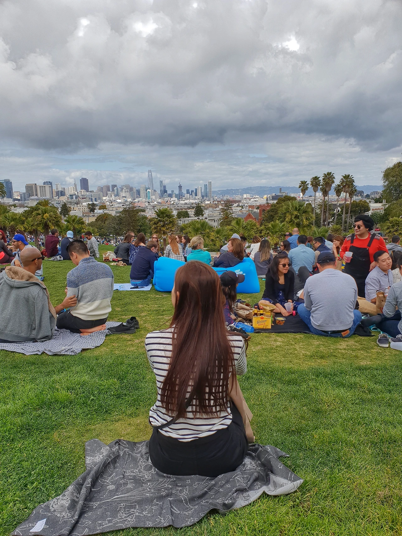 오늘은 계획 없이 움직이자고는 했지만 사실 마음속에 미리 찜해놓은 장소가 하나 있었다. 바로 Mission Dolores park라는 공원이었다. 서양을 여행하면 또 푸르른, 아니 초로록한 잔디에 누워 여유를 즐기는 것이 또 하나의 낭만 아니겠는가. 높은 언덕에 위치해서 샌프란시스코의 전망도 볼 수 있고, 널찍한 잔디가 깔려있어서 그 위에 누워 맑고 아름다운 캘리포니아의 하늘도 즐길 수 있고, 또 현지인들이 떠는 수다도 엿들을 수 있고, 또 산책 나온 강아지들도 볼 수 있고, 또 어쩌구 저쩌구…. 아 맞다. 오빠 근데 지금 몇 시야? 뭐? 벌써 그렇게 됐다구? 내 잔디는? 내 여유는? 내 낭만은…??!