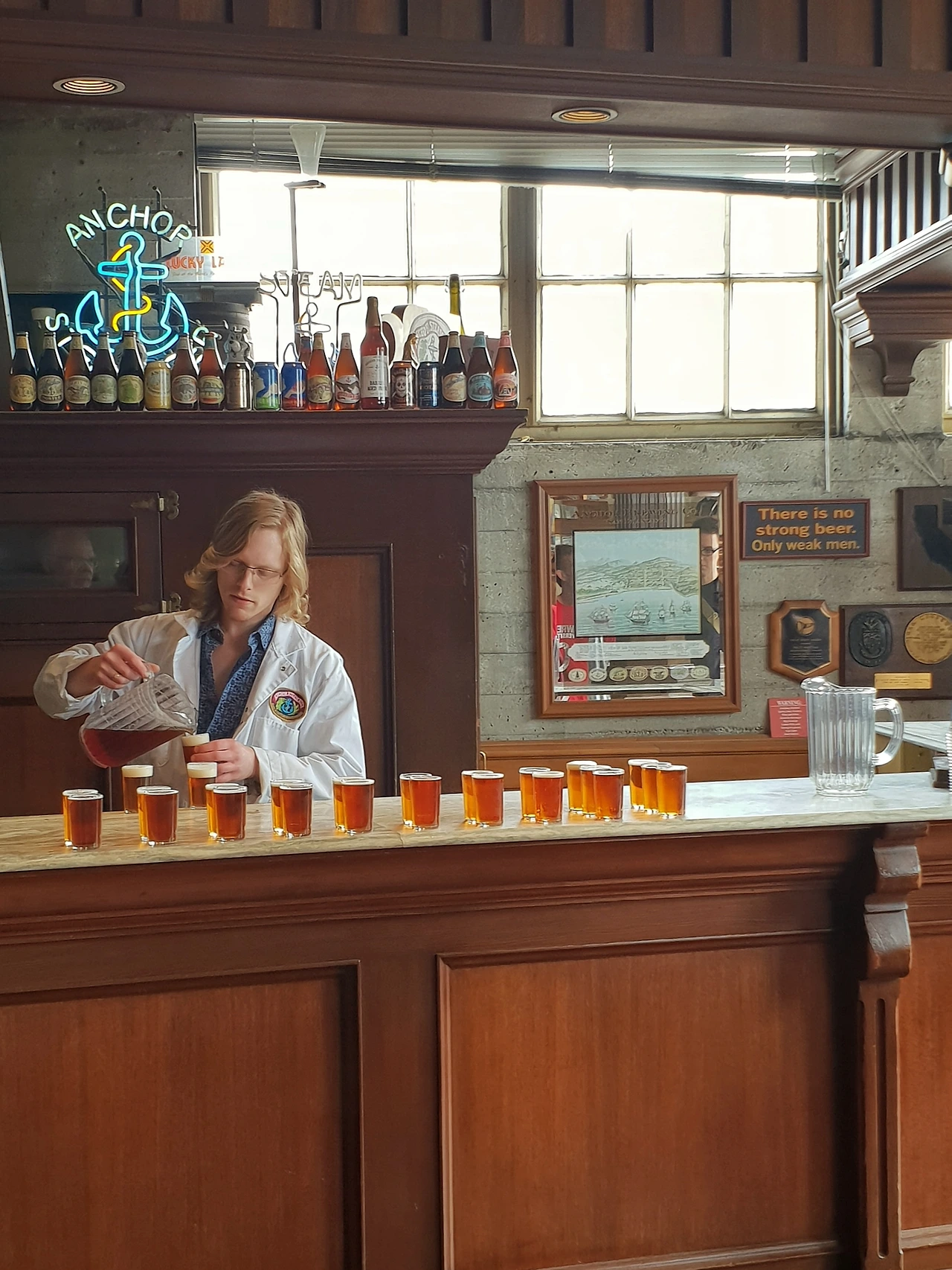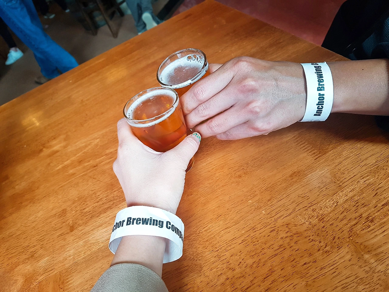 자, 이제 드디어 맥주를 공부하러 갈 시간이 되었다. 버스를 타고 우리가 찾아간 곳은 바로 ‘Anchor’라는 브랜드의 맥주 양조장이었다. 실험복을 입은 직원이 나와서는 Anchor의 역사부터 시작하여 그동안 Anchor가 어떤 맥주를 만들어 왔는지에 대해 설명해주었다. 20여 명의 사람들 중 동양인은 우리 둘 뿐이었는데, 그중에서도 영어를 잘 못하는 사람은 나 하나뿐이었던 것 같다. 직원이 농담을 던지면 모두가 깔깔깔 웃는데 나 혼자 어리둥절했다. 그런 내가 안쓰러웠는지 남편이 웃다 말고 내게 통역을 해주었다. 그러고 나면 나는 “아하~ 그 뜻이었구나!!”라고 말하며 하하하 웃었다. 그때쯤이면 이미 모두가 웃음을 멈추고 다음 이야기에 집중하고 있었기 때문에, 내 웃음소리는 참 민망하게도 울려 퍼졌다. 해외를 여행할 때마다 영어의 한계에 부딪히고 매번 더 열심히 할 것을 다짐하지만, 그 다짐도 매번 그때뿐임에 참 부끄러울 따름이다. 그렇게 머릿속에 ‘영어, 영어, 영어,….’를 외치며 공장 투어까지 한 바퀴 돌고 나니 드디어 시음 시간이 찾아왔다. 직원이 맥주에 대해 설명해준 뒤 작은 샘플 잔에다가 따라주면, 줄을 서서 그 잔을 받아오는 방식이었다. 그 작은 잔에 담긴 맥주가 얼마나 반갑던지…!!! 여행 중엔 1일 1 맥주를 실천해야 한다며 외쳤던 우리인데 이번 여행 동안은 이런저런 이유로 맥주를 멀리할 수밖에 없었다. 오늘도 원 없이 마실 수는 없겠지만, 그래도 스팀 비어, 흑맥주, 망고 에일, 썸머 비어 등 직원이 나누어주는 다양한 맥주들을 거의 다 시음했다. 아껴먹고 싶은데도 목구멍으로 꿀꺽꿀꺽 넘어가버리는 그 개운함! 오랜만에 마셔서일까. 아직 6시도 되지 않았는데 우리는 한껏 알딸딸해졌다.