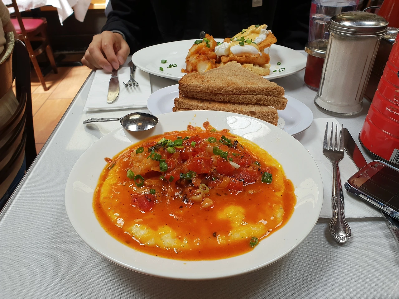 주린 배를 붙잡고 같이 서있는 서양인들을 힐끔힐끔 구경하며 50분쯤 대기했을까. 드디어 남편의 이름이 귀에 들려왔다. 우린 자리에 앉자마자 미리 결정해 둔 Shrimp&Grits와 Egg benedict를 정신없이 주문했다. 유명해서 멋모르고 시키긴 했다만 ‘Grits’가 무엇인지조차 몰라서 음식을 기다리는 동안 검색해보았다. 바로 ‘굵게 빻은 옥수수’라는 뜻이었는데, 주로 미국 남부에서 즐겨먹는다고 한다. 음식이 나오고 첫 숟가락을 뜨는 순간 입안에 퍼지는 토마토와 옥수수의 향미가 예술이었다. 웬만한 세계 음식은 다 먹을 수 있는 한국에서도, 그간 비슷한 것조차 먹어본 경험이 없다. 오랜만에 정말 새롭고도 황홀한 음식을 맛보았다. 비스킷 위에 수란이 올라간 에그 베네딕트는 맛있긴 했으나 비교적 평범한 맛이었다. 그릿츠가 워낙 특별했기 때문이리라.