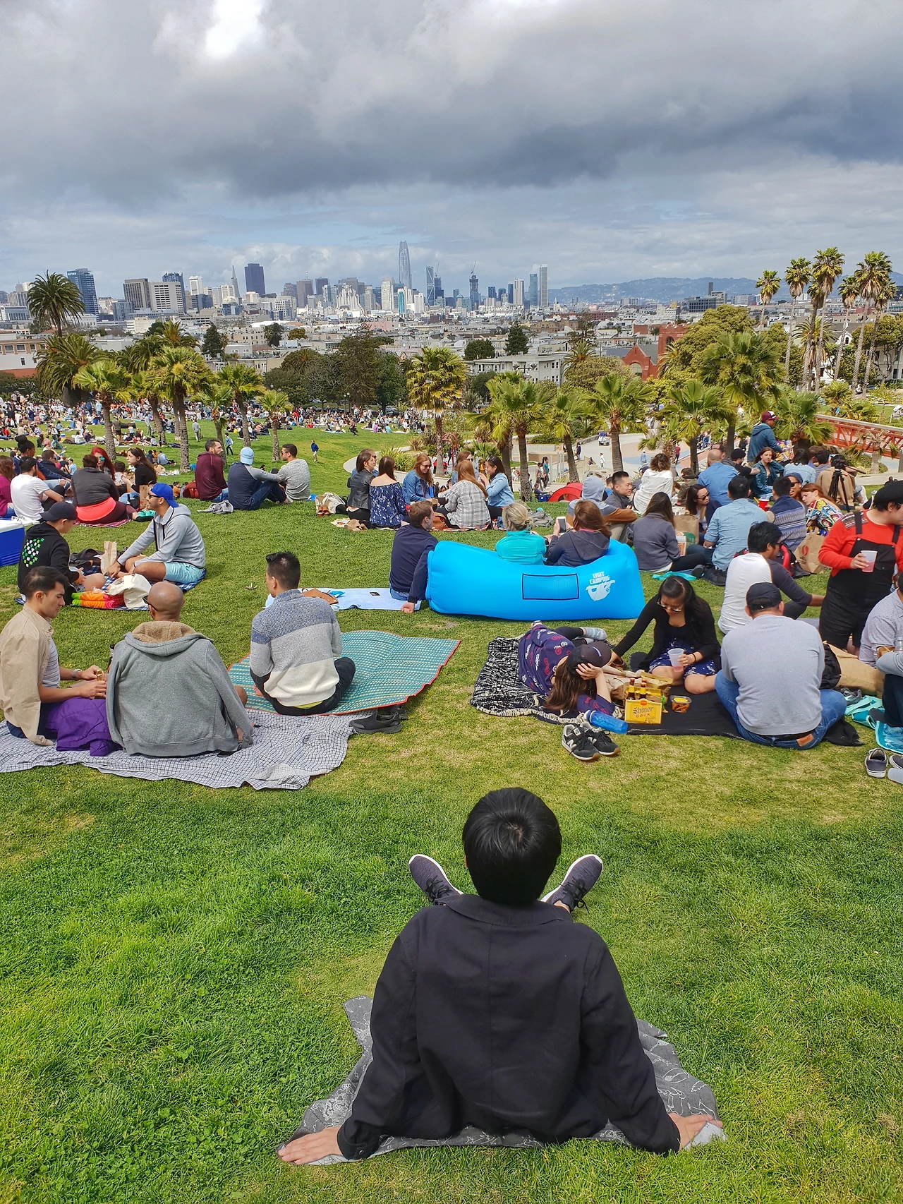 트램에서 내리는 순간 저 멀리 펼쳐지는 공원의 모습은 신선한 충격을 안겨주었다. 내가 기존에 알던 공원의 모습과는 차원이 달랐다. 고층 건물의 전망대 옥상에 거대한 잔디밭이 깔려있는 듯한 그런 느낌이랄까. 미국 드라마에서나 나올만한 광경들이 내 앞에서 생중계되고 있었다. 마침 주말이라 많은 현지인들이 빽빽하게 앉아서, 혹은 누워서 여유를 즐기고 있었기 때문이다. 그들은 맥주를 마시며 수다를 떨기도 하고 담배나 마리화나를 태우기도 했다. 그 사이에 우리 둘도 자리를 잡고서 잠시 누워보았다. 그동안 완전히 여행자의 신분으로 떠돌고 있었는데, 이 곳에 누워있는 순간만큼은 왠지 나도 샌프란시스코의 현지인이 된 느낌이었다. 구름이 동동 떠다니는 파아란 하늘이 얼마나 예쁘던지. 정말이지 이런 곳에서 맥주 한잔 하고 한 숨 잘 수만 있다면 모든 근심과 걱정이 날아갈 것만 같았다. 시간이 많지 않았지만 우린 여유까지는 못 부리더라도 쉼표, 정도는 부릴 수 있었다. 쉼표, 그것만으로도 행복을 느끼기엔 충분했다.
