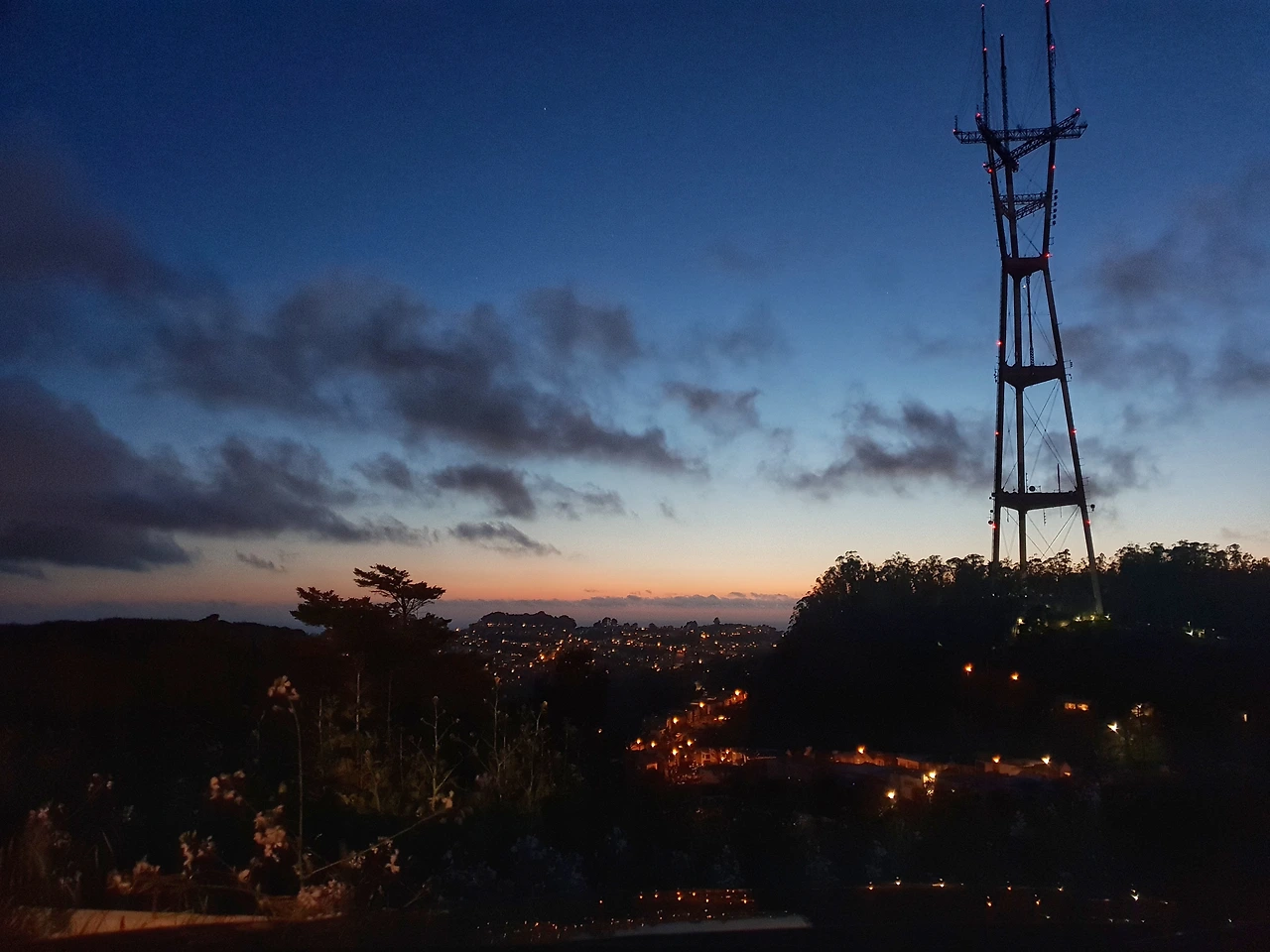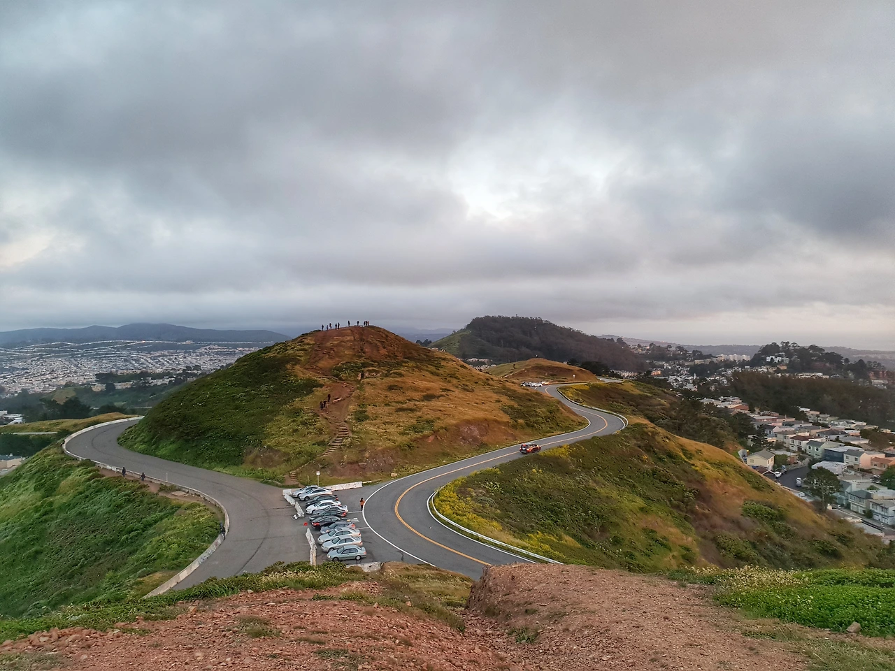 주차장에서 언덕 위로 걸어 올라가야 완전한 정상이 나왔기에, 우린 에베레스트산을 배경으로 눈보라를 헤쳐나가는 등반인들마냥 바람을 헤치며 한 발자국씩 겨우 나아갔다. 과장이 아니라 정말이지 이 바람이 나를 쓰러뜨릴 수도 있겠다는 생각이 들었다. 남편과 찰싹 붙어서 서로를 꼭 쥔 채로 겨우 정상에 올랐다. 100여 개의 계단을 올랐을 뿐인데도 우린 마치 큰 일을 해낸 것처럼 뿌듯했다. 이미 산 뒤로 넘어가버려서 보이지도 않는 해를 머릿속으로 상상하며, 자몽 주스처럼 물든 하늘을 바라보았다. 시선을 돌려 내려다보면 360도 모든 방향에서 각기 다른 샌프란시스코의 모습을 조망할 수 있었다. 특히 해가 지고 있는 방향에서 180도 몸을 돌리면, 샌프란시스코 도시부터 지평선으로 이어지는 샌프란시스코 만(bay)까지 한눈에 들어오는 끝내주는 전망이 있었다. 해는 못 봤지만 참 근사한 풍경이었다. 우린 바람 때문에 몸을 지탱하기 힘든 상황에서도, 자세를 한껏 낮추고 최대한 버텼다. 찍는 사진들마다 흔들려버렸지만 그래도 굳세게 셔터를 눌러댔다.
