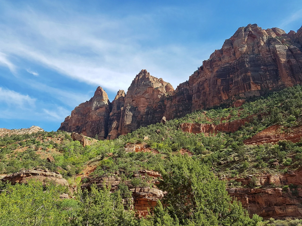 트래킹 코스는 생각했던 것보다 길었고, 천천히 즐기며 가니 세 시간 정도가 소요되었다. 막상 emerald pool보다는 걸어가는 과정에서 저 멀리 보이는 암석들의 웅장한 모습들이 더욱 인상 깊었다. 다양한 형태로 삐죽삐죽 서있는 기암괴석들의 줄무늬들은 세월의 풍파가 만든 예술과도 같았다. 가로, 세로 층층이 비슷한 듯 교묘하게 다른 톤을 가진 주황빛 암석에, 깨알같이 자라 있는 초록 나무들이 색감의 조화에 정점을 찍주었다.