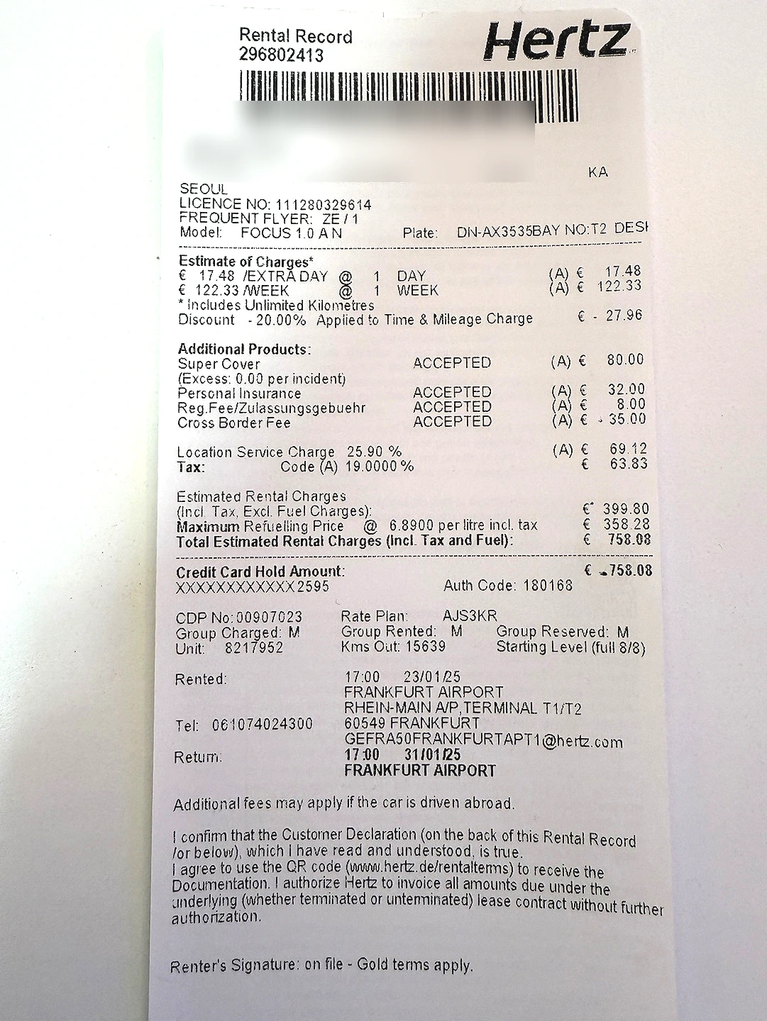 '여행과 지도'에서 받은 견적은 347.36유로였는데, 현지에서 결제한 금액은 399.8유로였다. 35유로의 크로스보더피를 감안하더라도 약 50유로 정도의 차이가 났다. 여행과지도에 문의해보니, 35유로 외에 현지 영업소 수수료 25.9%와 세금 19%가 더해져 399.8유로가 되었다는 설명이었다. 결국, 실질적인 크로스보더피 추가 비용은 35유로가 아닌 세금을 포함해 53유로를 지불한 셈이다.