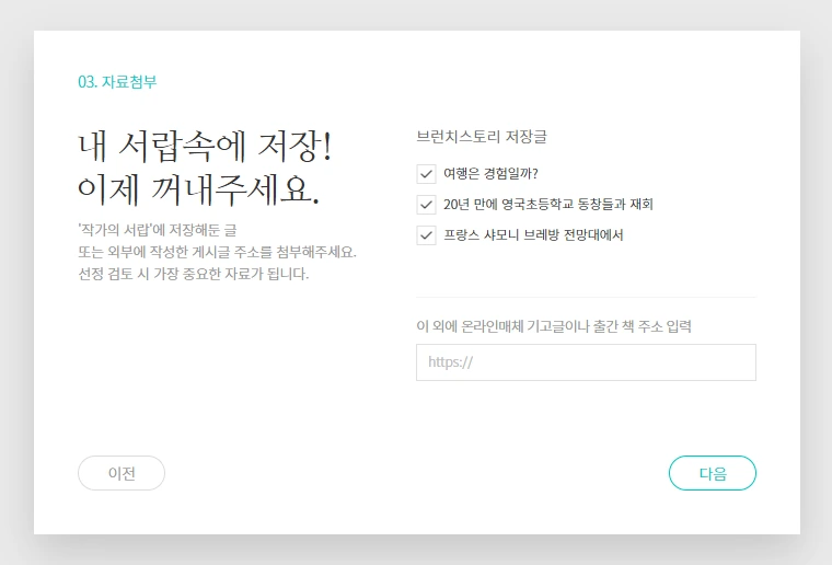 '03. 자료첨부'에 저장글(샘플) 3개를 제출할 수 있다. 저장글의 첫 번째 글인 '여행은 경험일까?' 글은 내 [인생을 여행처럼] 매거진 첫 번째 글로 업로드되어 있다. 내 글을 보면 알 수 있듯이 나는 글을 잘 쓰지 못한다. 누구나 쓸 수 있을 정도의 필력이다. 그래서 더욱이 한 번에 합격한다는 기대를 못했던 것 같다. 그럼에도 내가 한 번에 합격한 이유는 인터넷에 이미 나와 있는 정보나 모두가 아는 얘기가 아닌 '나만의 생각과 이야기를 가지고 있다'를 풀어낸 것이 합격의 주요 요인이라고 생각 든다.