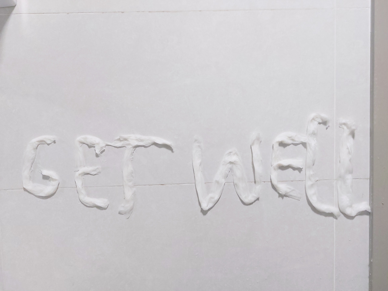 내가 감기 증상을 보이자 자기가 뭘 하는지 절대 보면 안 된다고 하더니 화장실 벽에 휴지로 Get Well이라고 붙여두었다. 이걸 보고 행복해진 울보 엄마는 또 울뻔했다