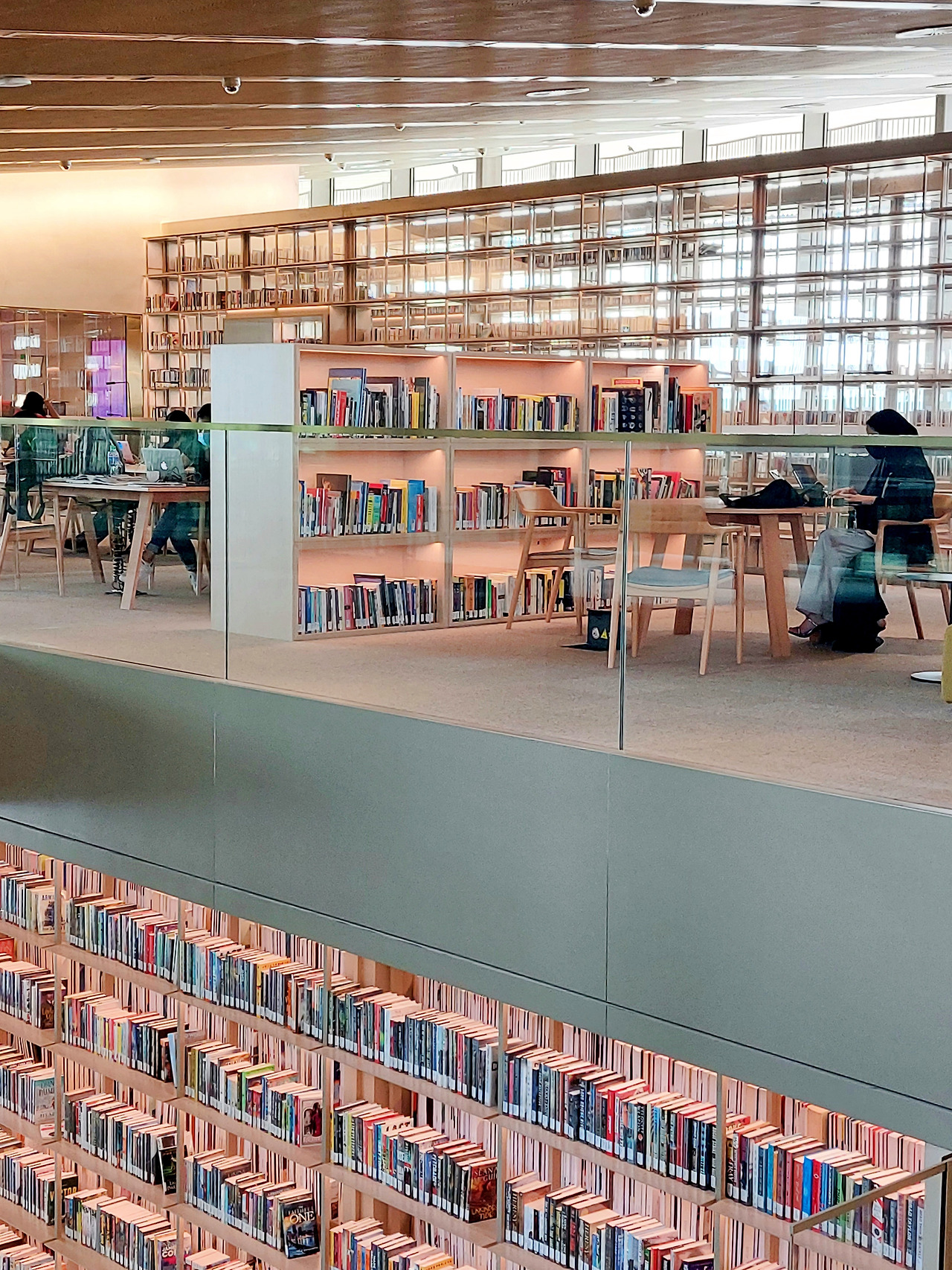 샤르자 지혜의 집도 고대 바그다드에 존재했던 도서관의 정신을 계승한 곳이다. 이곳은 도서관이 기본적으로 갖추고 있는 학습 공간의 기능뿐 아니라 서로 다른 아이디어와 문화를 주고받는 문화의 중심지 역할까지 고려하여 설계되었다. 건물의 생김새에서부터 열린 마음이 잘 드러난다. 런던, 홍콩, 베이징 국제공항의 설계를 담당했던 포스터 앤드 파트너스(Foster + Partners)가 디자인한 도서관 건물은 언뜻, 외부 환경과의 조화를 강조하는 우리네 옛 한옥을 닮은 것도 같다. 단아한 모양새의 2층 건물에는 사방으로 큼직한 창문이 나 있어 그곳을 통해 주변의 자연환경이 도서관 내부로 쏟아져 들어온다. 아랍에미리트의 대표적인 오아시스를 모티프로 해 만들었다는 건물 중앙 정원에서는 뚫려 있는 상층부를 통해 내리쬐는 햇살을 만끽할 수도 있다. 12,000제곱미터에 이르는 작지 않은 규모이지만, 자연의 빛을 최대한 안으로 끌어들이도록 설계한 덕에 인공조명의 힘은 최소한만 빌릴 수 있게 되었다고 한다. 과연 내부에서 외부로 또 외부에서 내부로 물 흐르듯 섞여 드는 빛과 풍경이 아름다운 조화를 이루는 멋진 공간이다. 건물 둘레에 조성된 정원도 단정하다. 중동의 자연환경을 보여주는 정원과 도서관 건물을 사이에 두고 반대편에 조성된 일본식 정원은 그 길을 산책하는 것만으로도 마음을 차분하게 만들어 주는 힘이 있다.