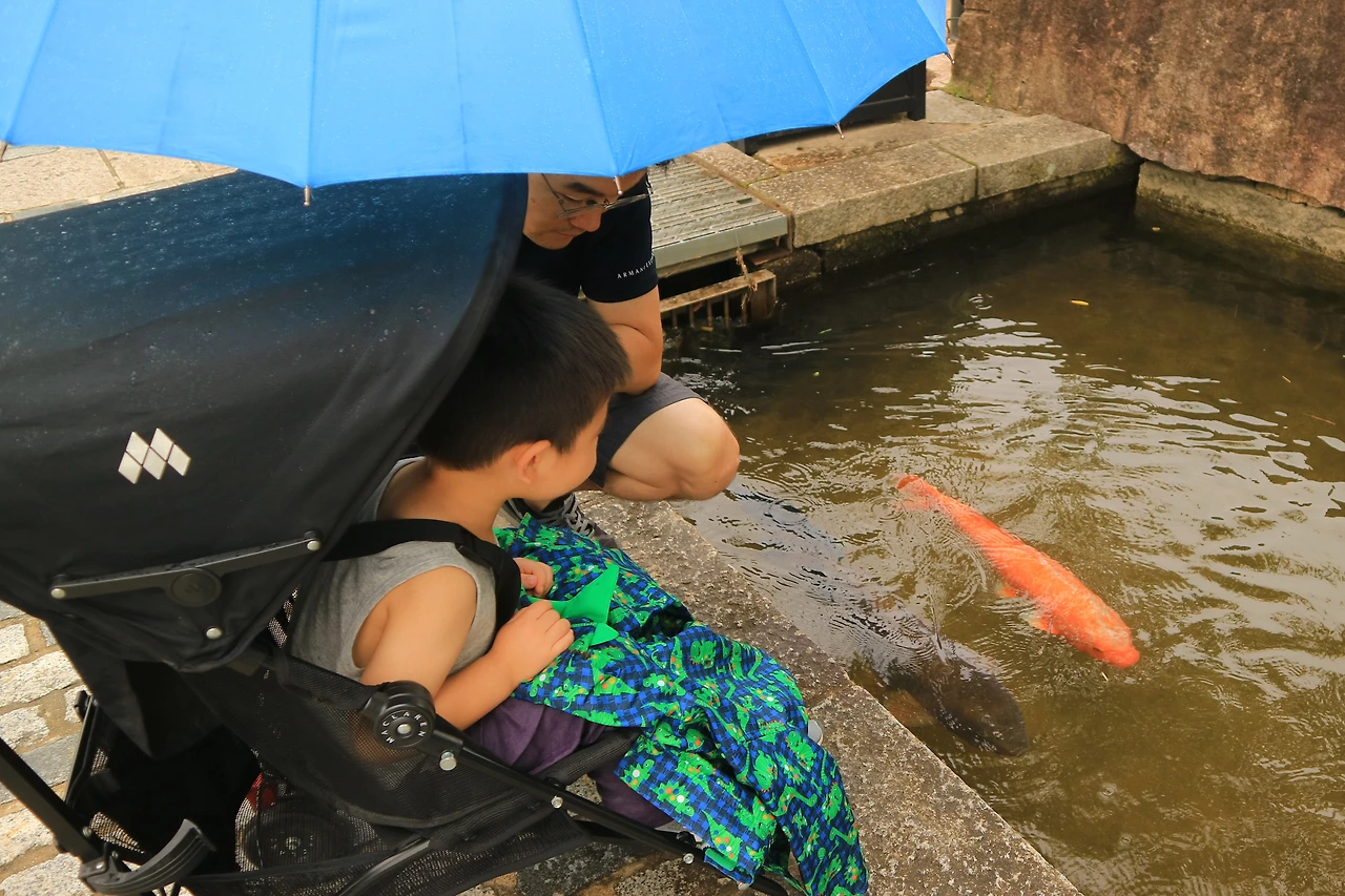 마을 중심에는 수로(물길)가 있었다. 미야가와의 지류인 세토가와가 이 마을의 수로를 따라 흐르는 것인데 오래전에는 물이 얼마나 깨끗했던지 먹거리를 씻는 용도로도 사용할 수 있을 정도였다고 한다. 하지만 마을의 발전에 환경오염이 수반되는 일이 히다에서만 예외일 수는 없었나 보다. 마을이 팽창하면서 점차 오염되어 가는 세토가와를 살리겠다고 나선 것은 주민들이었단다. 그들은 잉어가 살 수 있을 정도로 물을 깨끗하게 유지하겠다는 생각으로 자발적으로 그 강에 잉어 떼를 풀어 키우고 환경을 보호하기 시작했다. 그 노력 덕분에 오늘날 이 고장에서는 자유롭게 헤엄쳐 다니는 어린아이만 한 커다란 잉어 떼를 심심치 않게 만나 볼 수 있게 되었다. 잉어 먹이를 파는 무인판매대가 있길래 우리도 100엔을 내고 한 봉지를 샀다. 그리고 수로 옆에 걸터앉은 나는 무릎에 아이를 앉히고 함께 잉어에게 먹이를 던져주었다. 커다란 물고기들은 간에 기별도 안 가게 생긴 조그만 덩어리가 물에 닿자마자 어찌 알고 그렇게 찾아와 날름날름 잘도 받아먹던지. 그 장면은 마치 식성 좋았던 우리 아이의 어린 시절을 떠오르게 해 나는 잠시 추억에 잠기기도 했다. 우산을 들고 마을을 산책하다가 조그마한 문화관에도 들어가 보고 따뜻한 느낌의 나무창살이 기억에 남는 가게에서 점심도 먹다 보니 어느덧 비가 그쳐 있었다. 이제 도서관으로 돌아가야 할 시간이다.