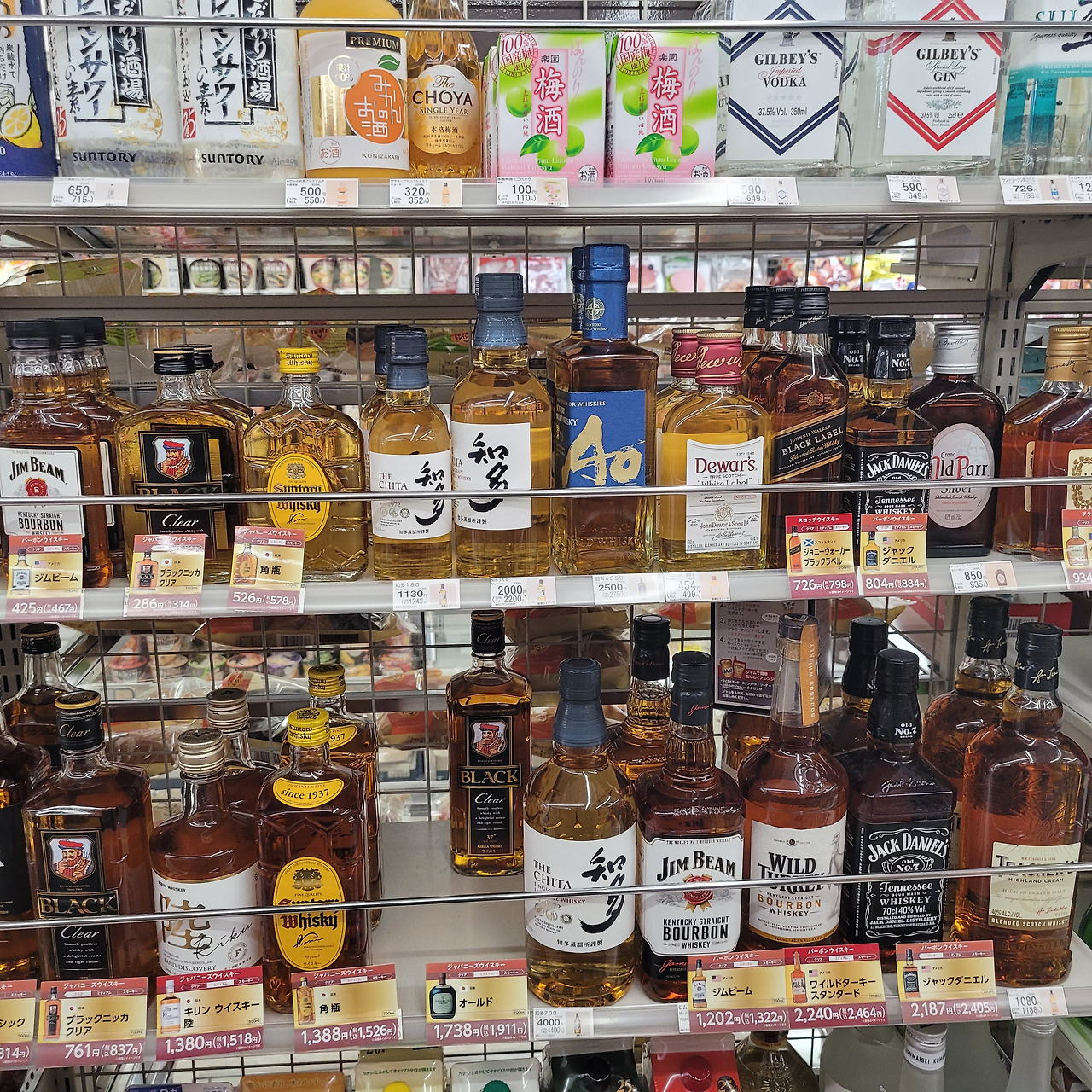 일본은 위스키나 와인이 한국에 비해 매우 저렴한 편이다. 건강에야 안 좋지만, 이래저래 술 먹고 놀기 좋은 곳이다. 나와 여행을 같이 갔던 J는 그 이후로도 지금까지 몇 차례 일본에 다녀오면서 와인을 많이 사 오더라. 잭다니엘 (ジャックダニエル) 700 mL 가격이 세금 포함 2,405엔인데 한국에서는 4만원 중후반 대 정도 하는 것 같고, 그것 말고도 재패니즈 위스키 (ジャパニーズウィスキー)라고 쓰여 있는 기린 위스키 리쿠(キリンウィスキー陸)나 산토리 위스키 가쿠빈 (角瓶)과 같은 국산 위스키들도 많이 진열되어 있어서 합리적 가격에서 적당한 위스키를 고를 수 있어 보인다. 누구에게서 한국은 위스키 사업하는 게 세금 때문에 어렵다는 이야기를 들은 것 같기도 하고.